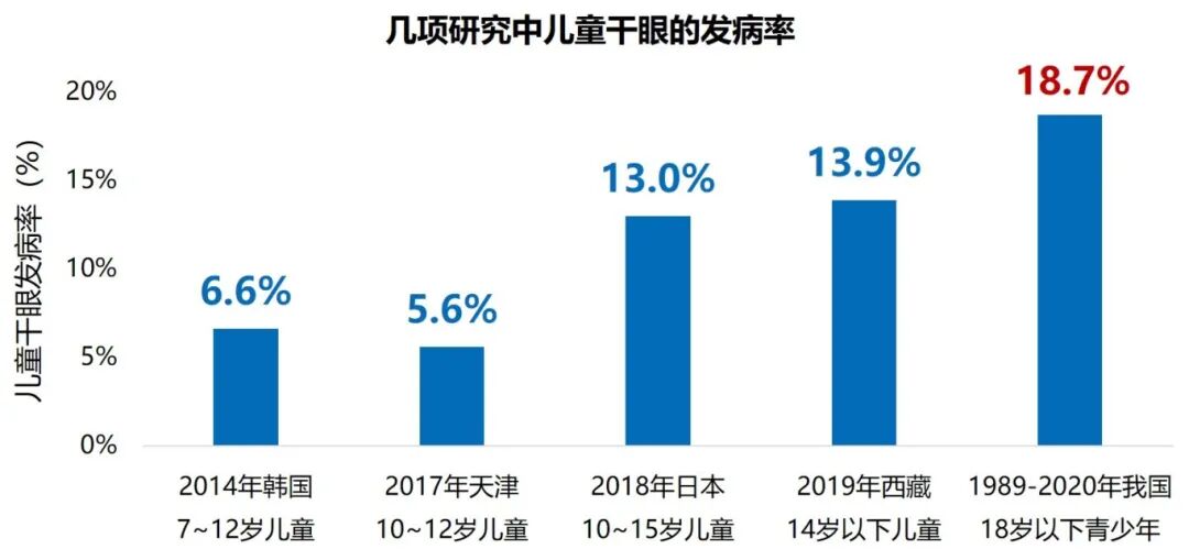 儿童干眼曾被认为是一种少见疾病,但近年来随着科技的发展和环境的变化,电子产品使用急剧增多,儿童干眼人数呈快速上升态势1。据统计,目前我国18岁以下青少年干眼患病率达18.7%2,相当于每10个孩子中将近2个有干眼(图1)。