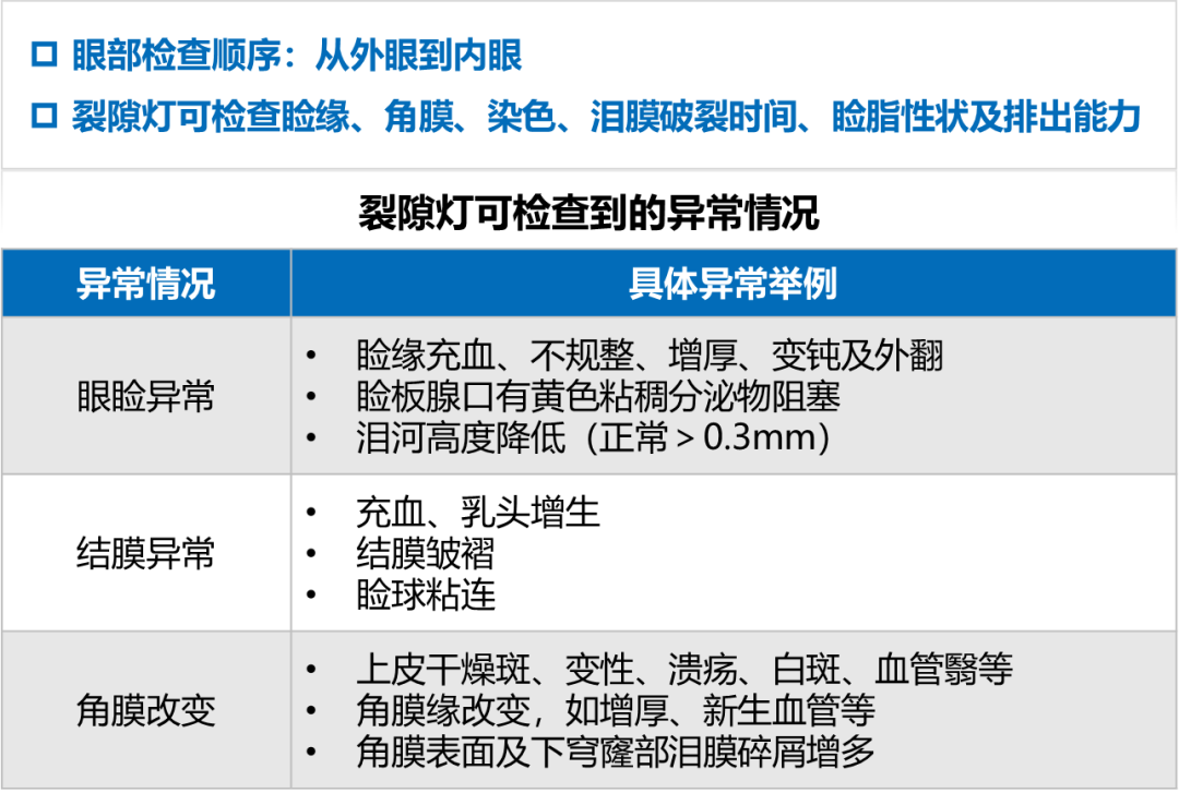 裂隙灯检查可发现眼睑异常、结膜异常和角膜改变1,4(图6)。