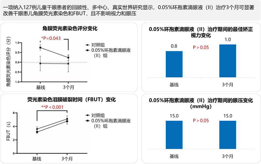 儿童干眼患病率不断增加,应引起足够的关注。然而,由于儿童年龄较小、症状表述能力有限,且检查与治疗时配合度较差,使得干眼的诊断与治疗变得较为棘手。因此,在诊断时,应特别关注儿童的异常行为学表现;在治疗时,则应选择更适合儿童的、更温和的治疗方式,如0.05%环孢素滴眼液(II),该药物眼部刺激小、不含防腐剂、对全身影响小,是治疗儿童干眼的一种安全有效的选择。