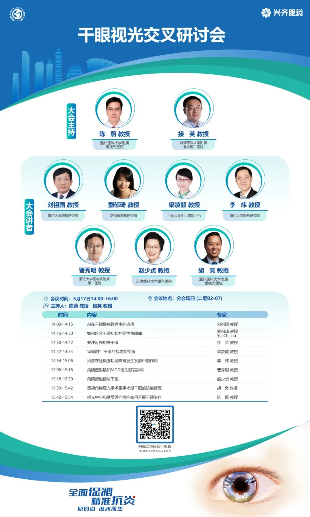 随着科技的飞速发展和生活方式的不断演变,视觉健康面临前所未有的挑战与机遇。为加强眼科领域的交流,促进眼科交叉领域的相互协作,2024年5月16日至5月19日,“2024视觉健康创新发展国际论坛”将在温州瓯海奥体龙舟运动中心举行,值此盛会之际,兴齐眼药将于5月17日13:00-14:00在分会场1(二层会议室一)举办“点亮睛彩 兴火相传专题会”;同期14:00-16:00将在分会场4(二层B2-07)举行“干眼视光交叉研讨会”,各眼科专家将跨学科合作,进行深入探讨与经验分享!于5月17日至5月18日还将在展位A29举行“控近视 兴未来”主题展台,进行精彩互动。此次活动将诚邀您共同见证“睛”彩时刻!