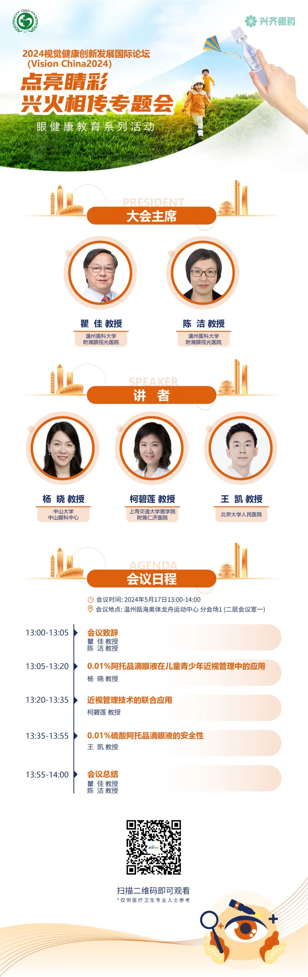 面对儿童和青少年近视问题的全球性挑战,我们比以往任何时候都更需要集结智慧、共享经验、携手合作。为提高儿童和青少年眼健康水平,增强大众对于近视防控与管理的认知,实现我国近视临床诊疗体系的规范化、国际化、标准化,兴齐眼药将于5月17日13:00-14:00在分会场1(二层会议室一)举办“点亮精彩 兴火相传专题会”,本次会议将特邀温州医科大学附属眼视光医院瞿佳教授和陈洁教授担任大会主席,诚邀中山大学中山眼科中心杨晓教授、上海交通大学医学院附属仁济医院柯碧莲教授、北京大学人民医院王凯教授分别带来近视防控与治疗的精彩演讲,0.01%硫酸阿托品滴眼液有望成为眼科医生手中儿童青少年近视防控与治疗的强力武器!集思广益,汇聚精华,知识与洞见交织,共同推动眼科领域的学术交流!