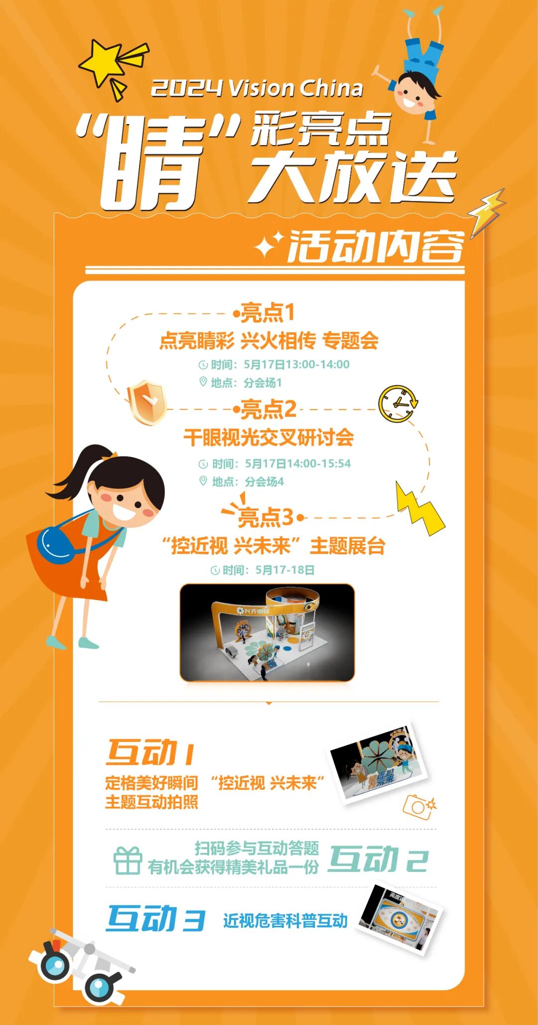 为集结眼科领域的专业智慧,直击近视防控的现状,“控近视 兴未来”主题展台将于5月17日至5月18日在展位A29举办,同期,还将进行“控近视 兴未来”主题互动拍照、“扫码参与互动答题”有机会获得精美礼品一份以及“近视危害科普互动”等一系列精彩互动环节。此次活动,寓教于乐,精彩纷呈,旨在让每一位参与者都能在享受快乐的同时,对近视防控有更深刻的理解和认识,诚邀您共同探索眼科视界,齐筑眼健康未来!