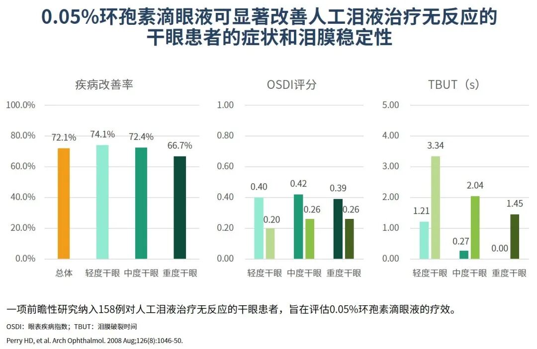 一项前瞻性研究表明,对于人工泪液治疗效果不佳的干眼患者,使用0.05%环孢素滴眼液的总体改善率为72.1%,其中轻度干眼患者的症状改善最显著(图3)5。