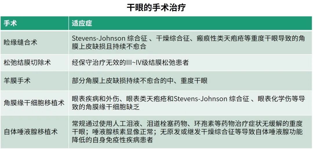 对于泪液分泌明显减少,常规治疗方法效果不佳,且有可能导致视力严重受损的重度干眼患者可以考虑手术治疗(图8)1。