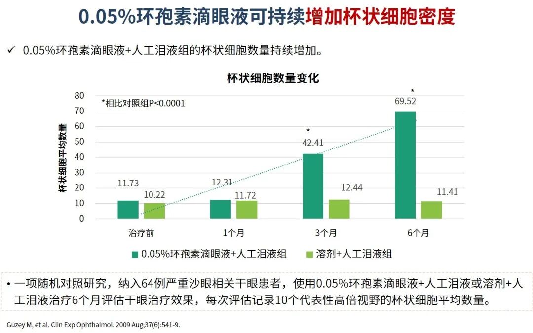 干眼治疗手段随着医疗水平的发展逐渐多样化,需根据患者的干眼程度和类型,制定个体化的治疗策略,缓解患者干眼的体征和症状。抗炎治疗是干眼治疗的重要措施,0.05%环孢素滴眼液是中长期维持抗炎治疗的优选,不仅可以精准有效的阻断干眼炎症的恶性循环,还具有增加杯状细胞密度,促进泪液分泌的效果。