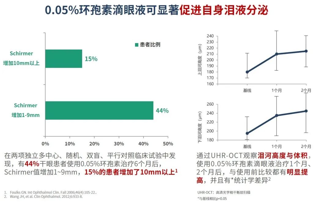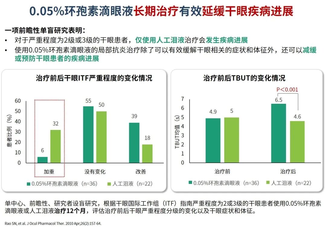 国际相关指南和中国干眼患者的多中心随机对照临床研究均表明,0.05%环孢素滴眼液可有效阻止或延缓干眼疾病进展,优于单独使用人工泪液治疗(图1-2)2-4。