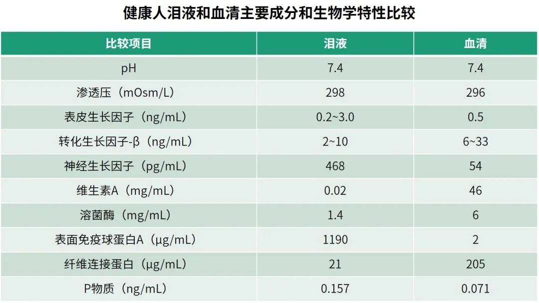 1.自体血清:成分和生物学特性与泪液非常相似(图6),富含丰富的生长因子和维生素等营养物质,不仅可以作为泪液的替代品,还可促进角膜上皮细胞增殖分化,维持眼表微环境稳定,促进神经修复1。