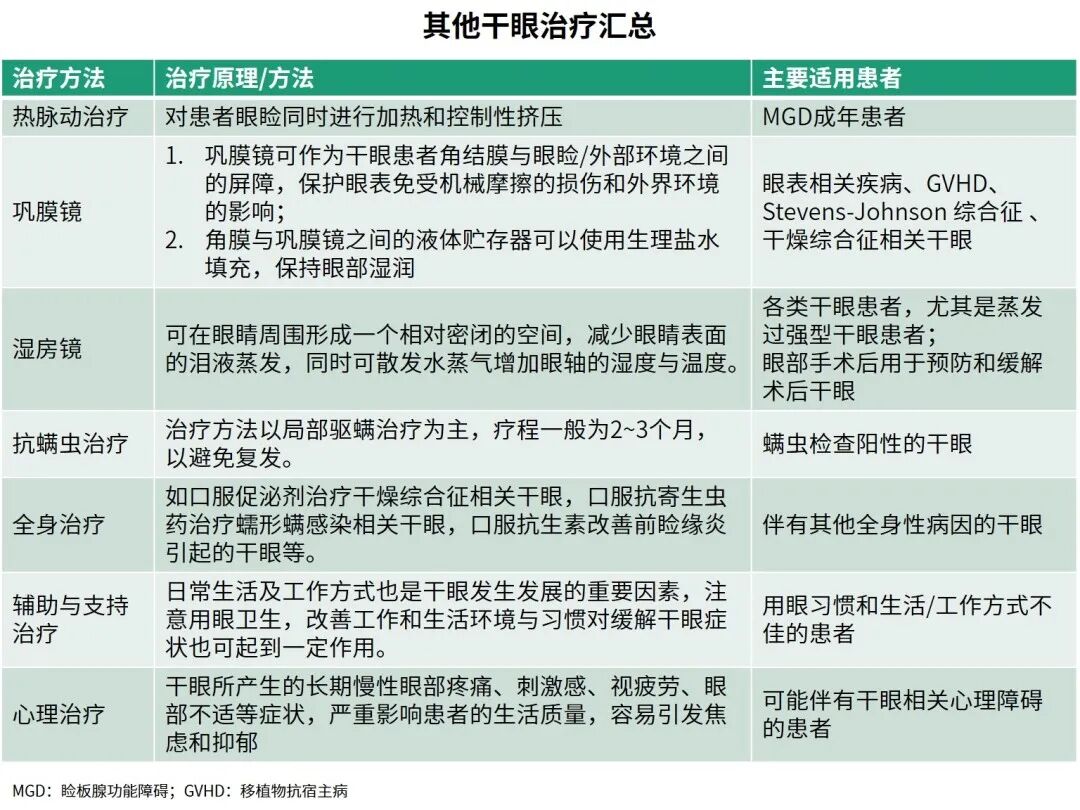 目前,干眼的治疗多从润滑眼表、抗炎等方面入手,并针对病因结合多种治疗手段。下面,让我们一起看看《中国干眼临床诊疗指南》中关于干眼的治疗有何推荐?