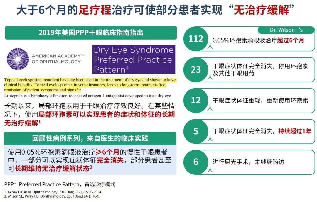2.免疫抑制剂:临床常用药物包括他克莫司和环孢素A。由于绝大多数干眼是慢性疾病,0.05%环孢素滴眼液是中长期维持用药的优选1-2。