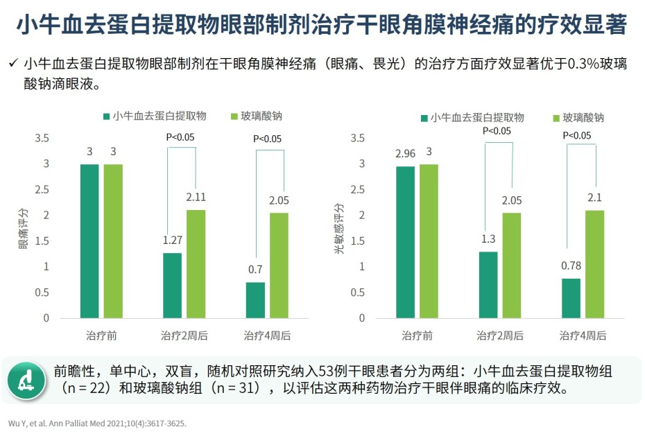 3.其他血液制品:小牛血去蛋白提取物眼部制剂含有多种生物活性成分,可促进眼表上皮神经修复、改善眼表微环境。《中国干眼专家共识:治疗(2020年)》中指出小牛血去蛋白提取物眼部制剂适用于伴有眼表损伤或角膜神经痛等多因素的中、重度干眼患者(图7)9。