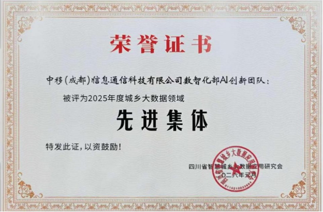 1月17日,四川省智慧城乡大数据应用研究会第二届理事会第四次理事(扩大)会在成都机器人创新中心召开。会上,中国移动(成都)产业研究院(以下简称“成研院”)数智化部AI创新团队凭借突出贡献,斩获“2025年度城乡大数据领域‘先进集体’”荣誉。