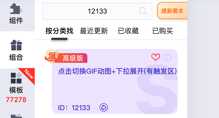 登录i排版SVG编辑器后,点击编辑器左侧「组合」按钮,在「花样展开」分类中找到「点击切换GIF动图+下拉展开(有触发区)」组合,或者在组合中直接搜索编号12133,点击选择。