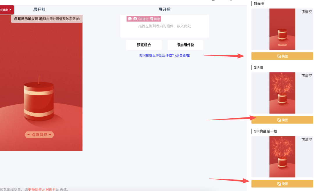 点击「展开前」区域,接着点击右侧三个「换图」按钮,分别上传封面图、GIF图和GIF的最后一帧图片。