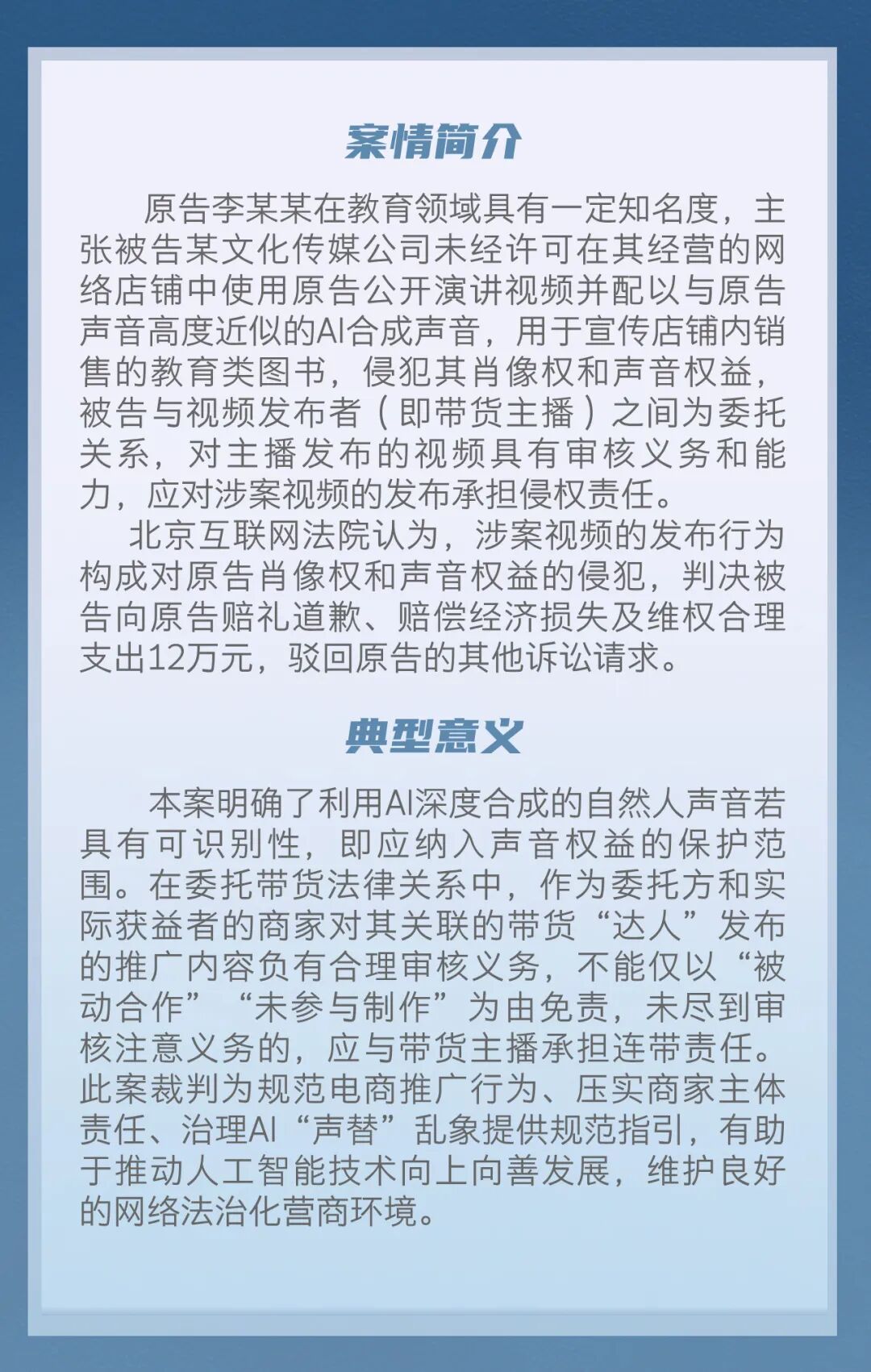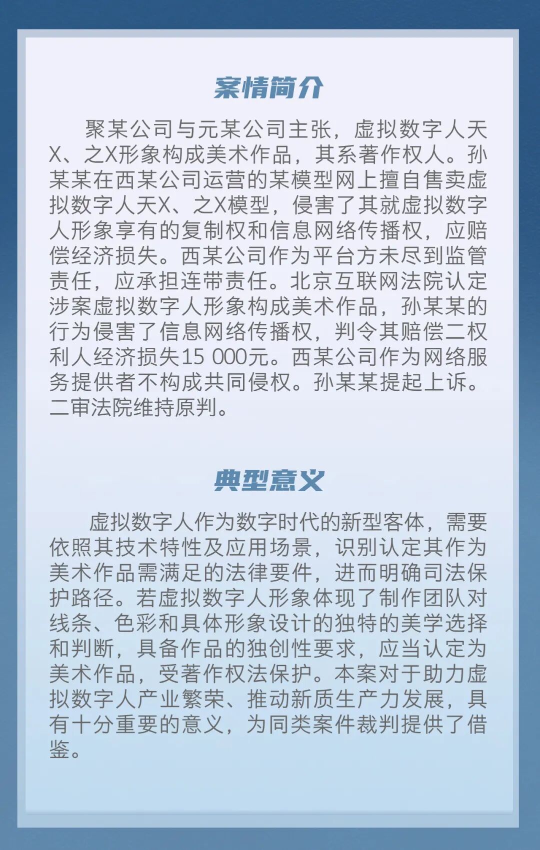 加强数据合法权益保护,审结涉数据产权、人工智能等案件9963件,坚持依法规范与促进发展相结合,在“AI生成声音带货”“虚拟数字人形象侵权”“变身漫画特效不正当竞争”“非法抓取网络平台数据集合”等有重要影响的新类型案件中,发挥裁判规则指引作用,助力新业态新模式健康发展。