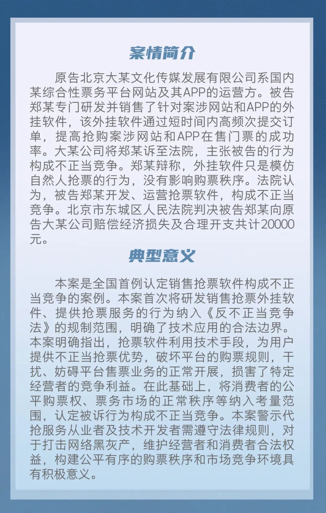 围绕提振消费、扩大内需,审结反垄断、反不正当竞争案件1429件,在全国首例销售抢票外挂软件不正当竞争、某行业协会横向垄断等案件中,依法规制排除限制竞争的行为,促进建设统一大市场。