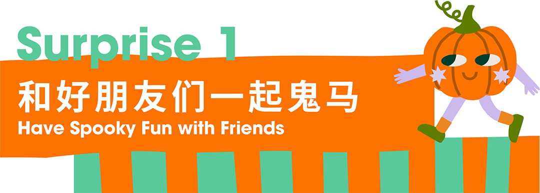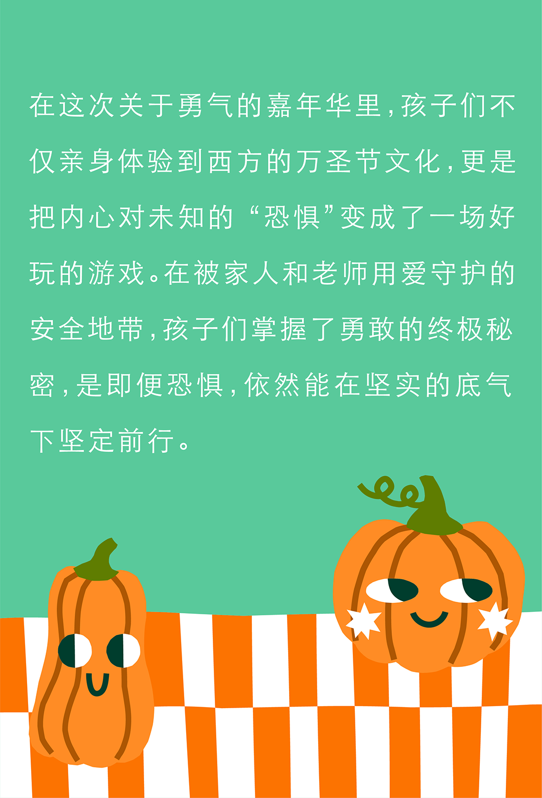 女巫的魔法汤会是什么味道?吵醒休息中的蜘蛛会发生什么?可爱的孩子们用勇气和自信武装自己,凭借智慧和灵活避开重重蛛网,穿过黑暗夺回被怪兽抢走的糖果;用神秘碎片搅拌出会发出“尖叫”的魔法药水;涂成“鬼”脸进行万圣“妆”扮;还可以变成“南瓜小鬼”,把南瓜玩出意想不到的花样!