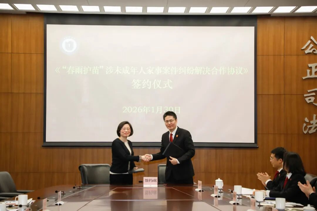 上海一中院未家庭庭长凌捷与上海市阳光社区青少年事务中心总干事黄旦闻共同签署了《“春雨护苗”涉未成年人家事案件纠纷解决合作协议》。该协议巩固了上海一中院与上海市阳光社区青少年事务中心在涉少家事纠纷解决方面的合作成果,进一步规范了青少年事务社工参与涉少家事案件工作的内容与方式。