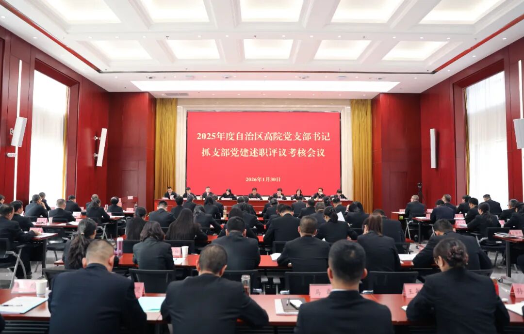 1月30日上午,自治区高级人民法院召开2025年度党支部书记抓支部党建工作述职评议考核会议,全面贯彻落实新时代党的建设总要求,压紧压实管党治院政治责任,推动机关党建与审判业务深度融合,以高质量党建引领保障全区审判工作高质量发展。自治区高级人民法院院领导,高院机关、银川铁路运输法院党支部书记、党员代表、干警代表参加会议。自治区直属机关工委第二督导组列席会议并指导点评。