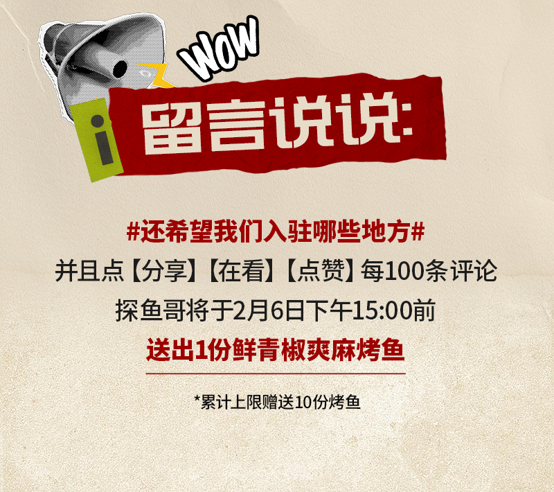 注:1.推文留言活动时间:2026年1月30日-2026年2月6日,2026年2月6日将在留言区公布留言中奖名单,奖品为鲜青椒爽麻烤鱼一份;2.奖品以卡券形式发放至会员卡包,具体卡券有效期与使用规则,可在【探鱼烤鱼】小程序 -【我的】-【优惠券】卡券详情中查看;3.仅限大陆地区探鱼餐厅堂食使用,华为店不参与活动;4.每个订单仅可使用一张卡券,不可与其他优惠同享,餐前不设外带;