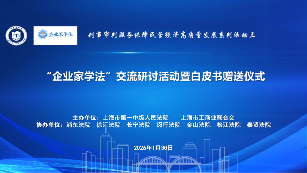 2026年1月30日下午,上海市第一中级人民法院(以下简称上海一中院)和辖区法院、上海市工商业联合会(以下简称上海工商联)共同举办“企业家学法”交流研讨活动暨白皮书赠送仪式,向与会企业家赠送七本审判白皮书和《企业刑事法律风险防范指南》,就近年来涉民营企业的刑事案件审判情况,向与会人员进行了通报,并对其中反映出的问题提出对策和建议。