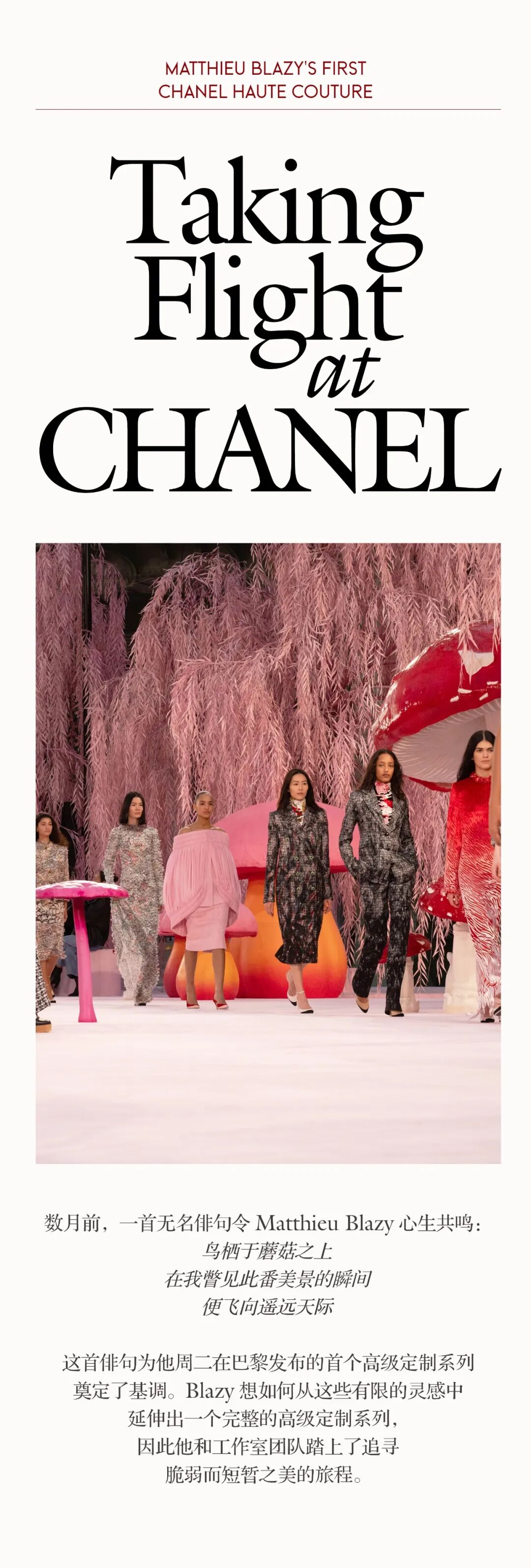 Blazy坚信高级定制要与人的身体产生互动,才能拥有真正的意义。他表示“这一季我们没有画任何草图,也没有参考任何时装影像。创作完全发生在身体之上:设计团队、工坊、裁缝、刺绣工艺师一起制作样本,将它们穿在模特身上,不断调整,判断是否成立。整组系列由身体建构。”香奈儿关注的是穿着的体验,并非世俗意义上的华服。