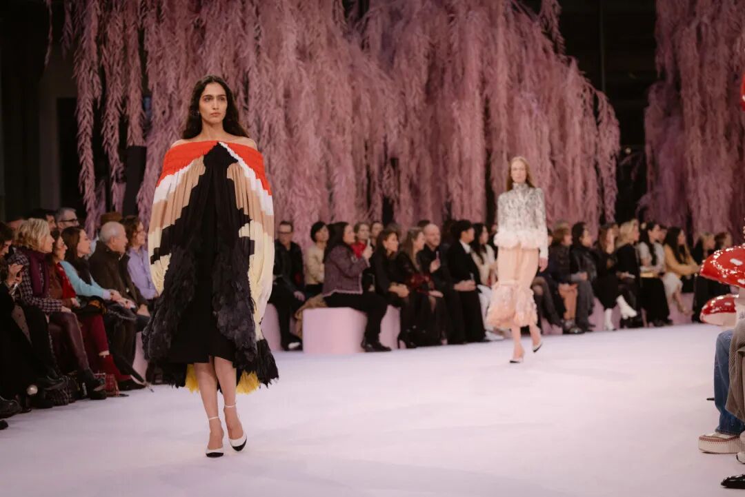 这种对戏剧性的拒绝并非“商业化”表现,而是对高级定制个人化的礼赞。“这些服装既是设计师的创作,更是穿着者的故事载体……为女性提供讲述自我故事的画布。”试装期间,品牌团队会询问模特们的生活故事,询问她们希望在服装上刺绣怎样的讯息。有的刺绣内容来自丈夫的情书,有的则仅绣下“仁慈”二字。