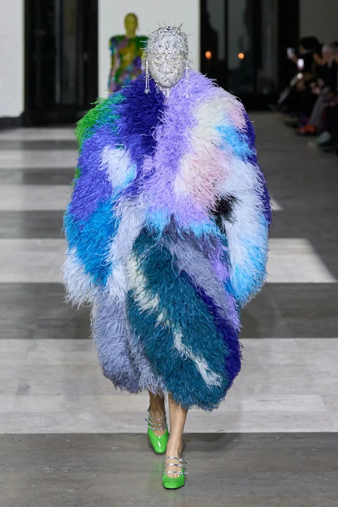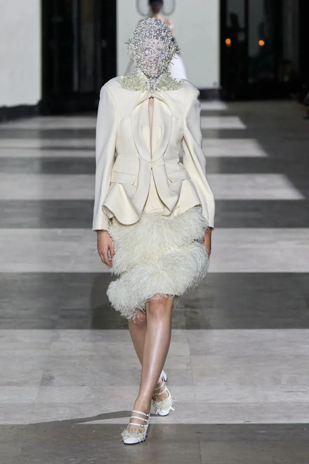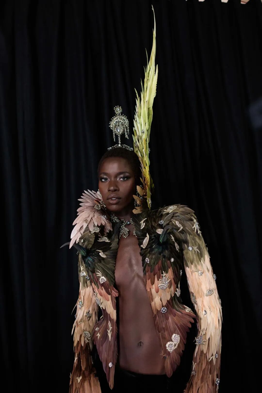 你会惊叹于他将自然生灵的翅膀、身躯、纹理和针刺,如此天衣无缝地融合在高定衣钵的廓形之中,模特似乎也成为了某种通灵的化身。而在惊艳的背后,是他用丝缎切割出数千片孔雀羽毛,再一簇簇平整地绣在夸张如教堂穹顶般宽阔的裙摆上,沿着廓形的弧度形成巧夺天工的光泽质感,亦或是用薄纱堆叠起候鸟起飞时的羽毛蓬勃昂扬的姿态,每个造型都似曾相识,如同对自然生灵的传神映照,却又不照本宣科。这便是Roseberry的高明之处,也是他值得骄傲的本领,就像闭场的两件羽毛夹克,是那么毫不掩饰地“炫耀”自己的才华,也同时让Elsa Schiaparelli的傲骨在21世纪得以显形。