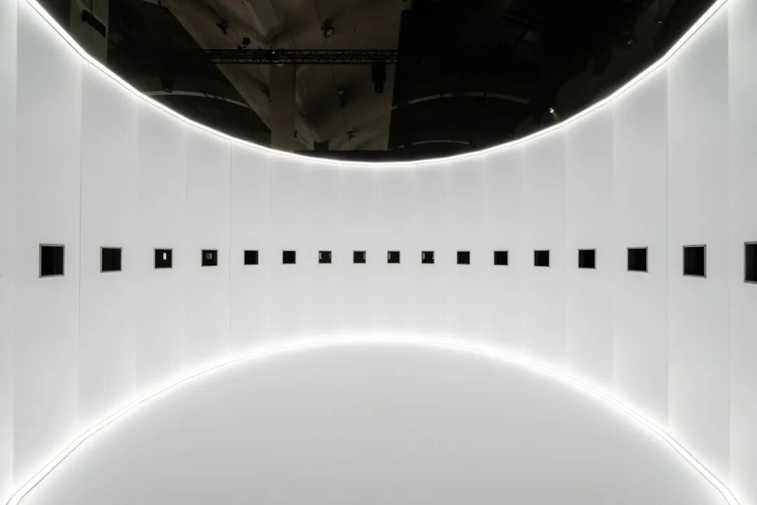 首先,秀场的布置就非常具有Michele在创作鼎盛时期的仪式感。十二座以十九世纪“凯撒全景”装置为灵感的“世界之镜”单元,打破了传统秀场观看的通道,让嘉宾们透过装置上狭窄有限的矩形窗口,从外向内地“窥探”每一套高定的展示过程。这种将视野收窄、聚焦的方式,倒是更便于观看和捕捉高定作品上的细节。
