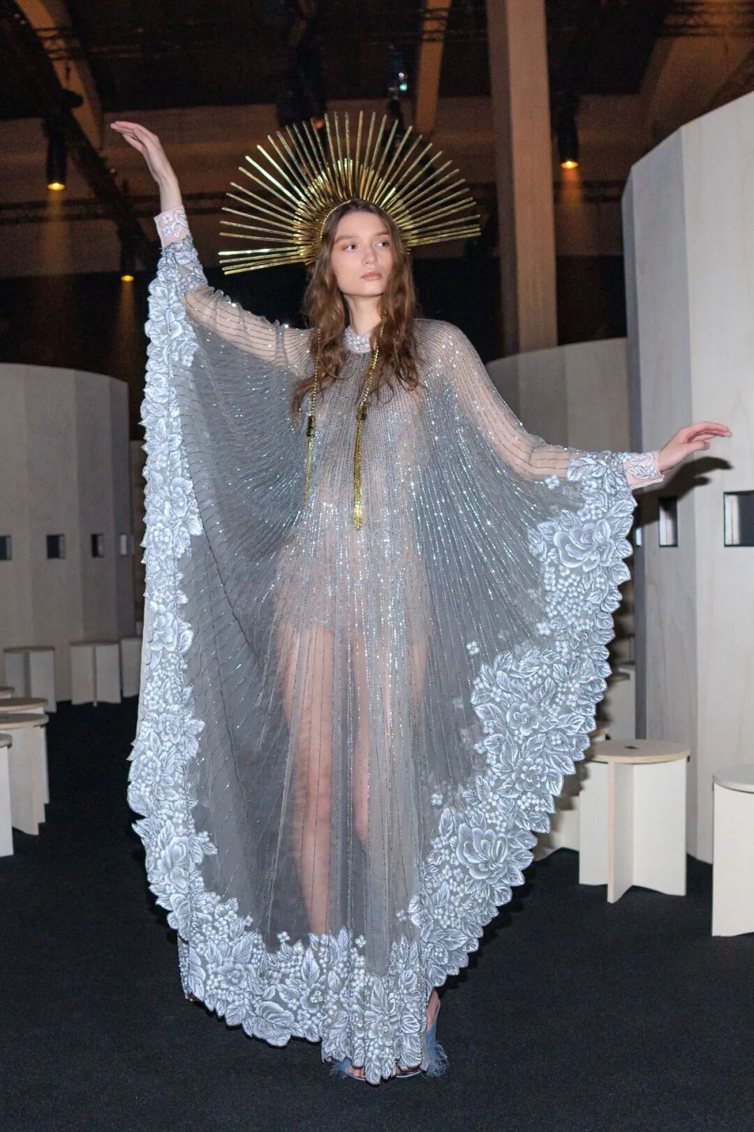 相比之下,拥有扎实工艺基础和民间文化积淀的印度高定品牌,倒是在近两年来走出了一条“神话性”的新路,他们并没有将印度的神话形象进行搬运,反而是对于那些空灵、抽象要素的捕捉,使他们实现了在高定结构、工艺和表现形式上的创新。中国市场熟悉的Rahul Mishra就是其中的代表,本季他的主题“炼金术”体现得颇为宏大,探讨了五大元素——以太、空气、水、火、土的瞬息万变,他将其称之为“高定的朝圣之旅”。而效果也十分惊艳,那些抽象的结构似乎脱离了地心引力,仿佛为高定赋予了新的灵性。