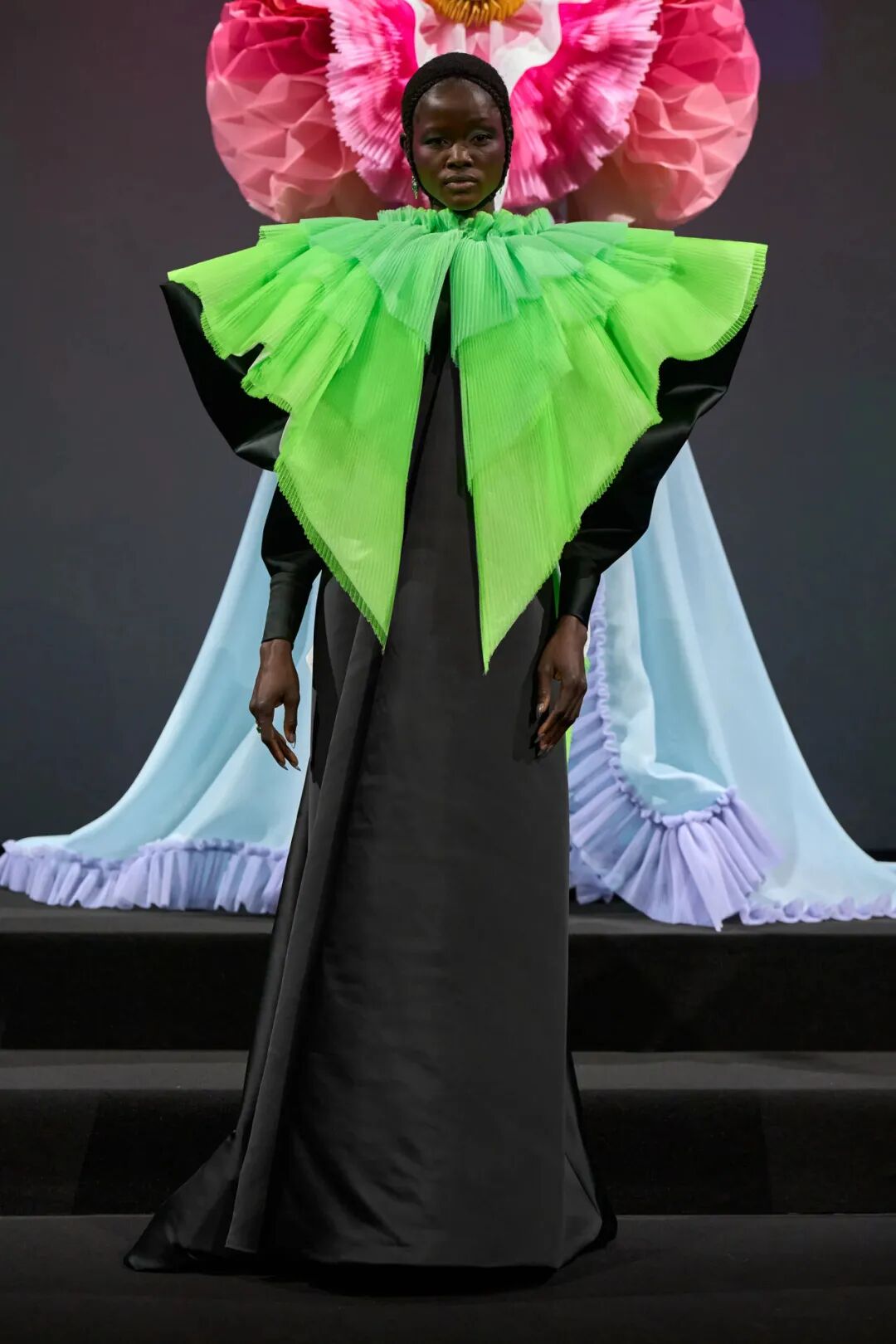 当Viktor Horsting 和 Rolf Snoeren与身着白色迷你裙的模特一起站到秀场中央,从随后一套套接踵而至的黑色礼服造型中拆下鲜艳的零件——褶边泡泡袖、领结、荷叶边、可拆卸的金属杆,一层层地“武装”在迷你裙上,直到全场唯一的那件白色的裙子变成了一面彩色的风筝,模特跟随着吊绳的牵引悬空,我们才逐渐发现其中的奥妙。看似随性的拆卸与组装,实则需要反复精密的演练,这次15+1的造型组合,也是他们酝酿了多年的作品。这样的新系列作品,体量不算庞大,当然也不够华丽,所以往往可能被人忽略,但Viktor & Rolf如此小而美的坚守,恰恰提醒着我们,高定不只是“蜜罐”,也依然可以是精妙的智性游戏,他们无疑是高定界最难以被复制的案例。