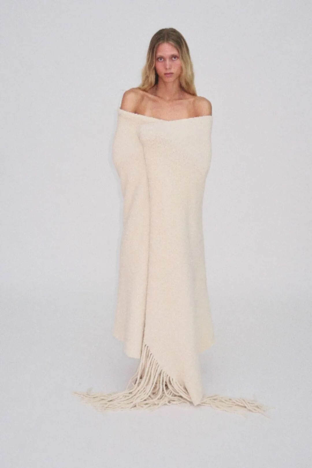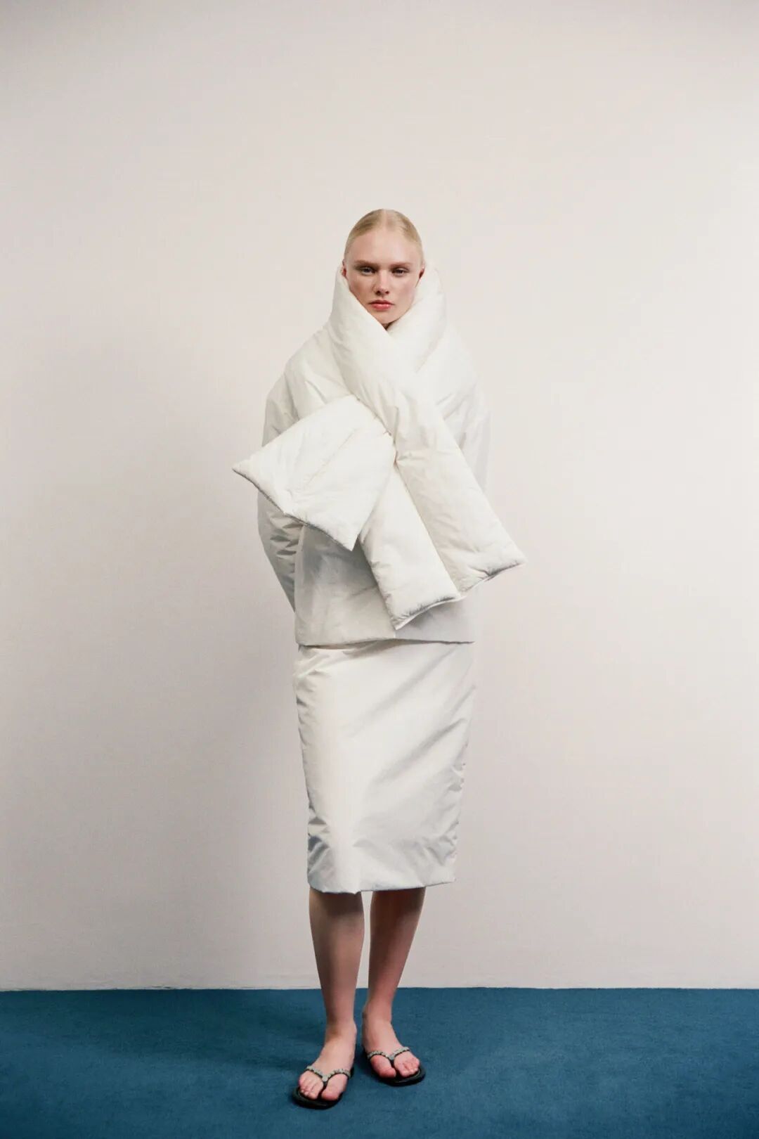 这种柔软并非懒散,而是一种对身体的重新理解。Staud把被子般的体积感直接带进造型:宽大的围裹结构、略显笨拙的比例,像是刚从床上起身就披在身上的第一件衣服。它不急着好看,却异常真实。你几乎可以想象穿着它在房间里走动的样子,慢、安静、没有目的。Natasha Zinko则把枕头变成了真正的时装语言,白色短裙与怀里的枕头形成一种近乎直白的隐喻:时装不再假装独立于生活,它干脆承认自己的来源。那一刻,时装像是对观众眨了下眼:我们都知道你真正想要的是什么。不是被看见,而是被托住。