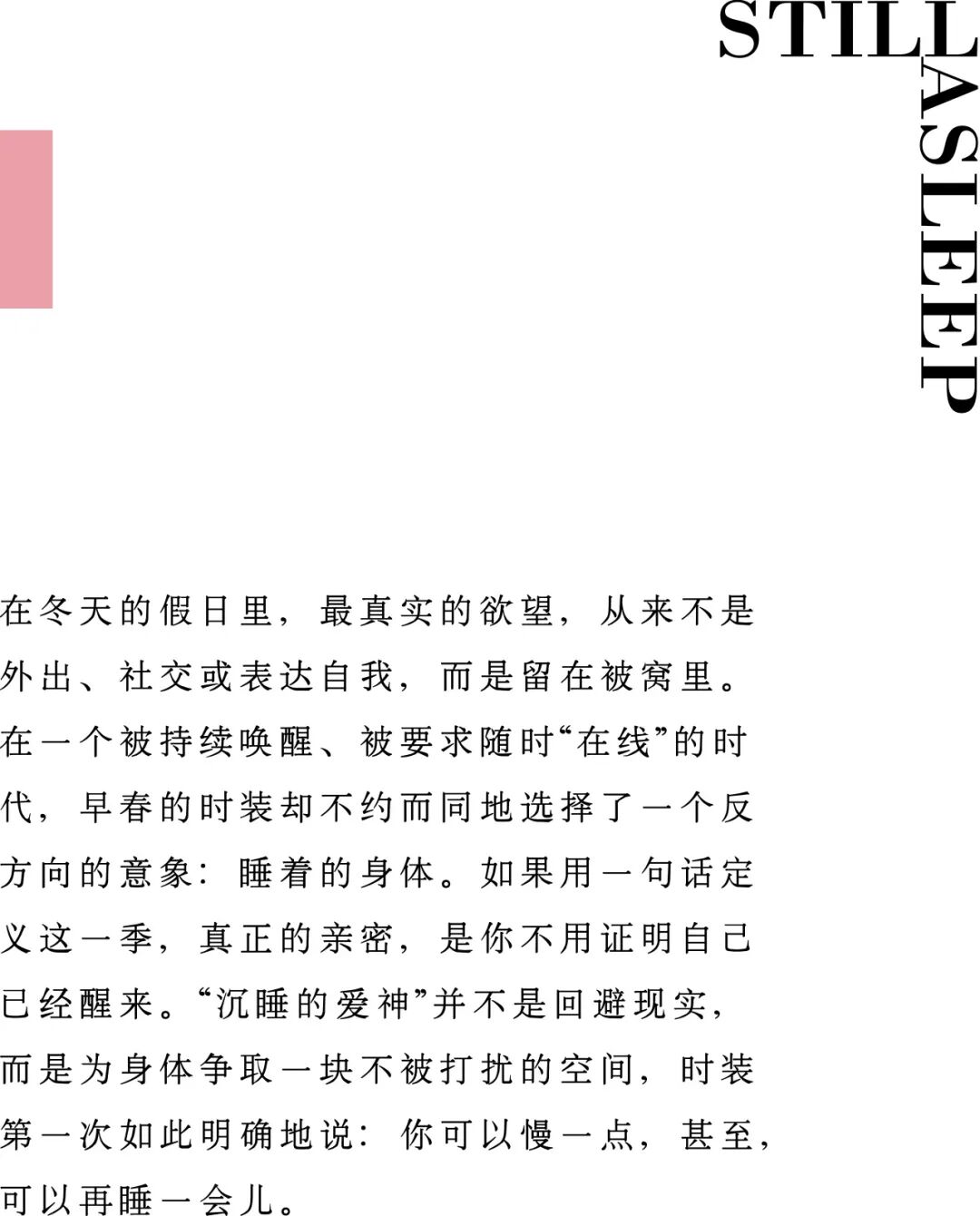在一个总被提醒要“醒着”的时代,时装选择站在身体这一边,显得既温柔又清醒。它没有把你叫醒,而是轻声说:没关系,你可以慢一点,世界会等你。
