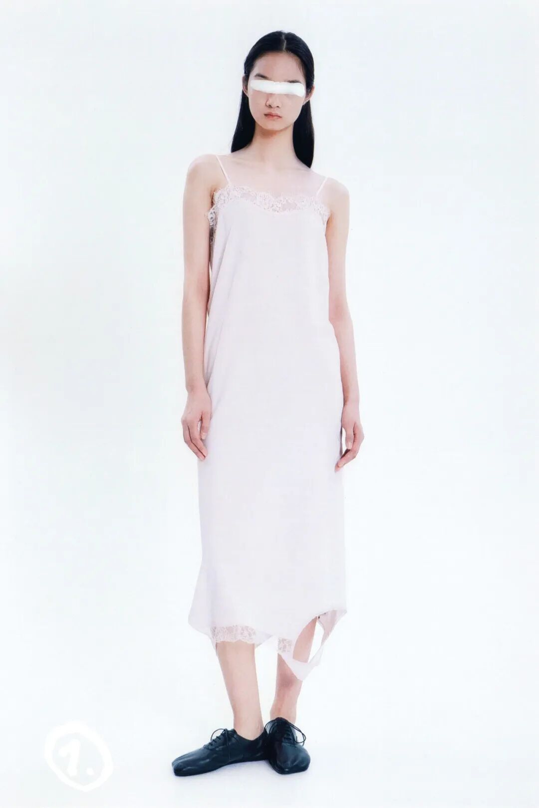 当这种“被托住”的感觉延伸到更实验的语境,MM6 Maison Margiela给出了一个几乎去除表情的答案。修长的白色连衣裙,模特的眼睛被遮住,身体直立却像仍停留在梦中。那是一种典型的Margiela式疏离:清醒地呈现不清醒。服装极度克制,却在结构上保留了睡衣的逻辑,没有多余的修饰,没有强迫的姿态,像一具安静的容器,等待身体自行填满。