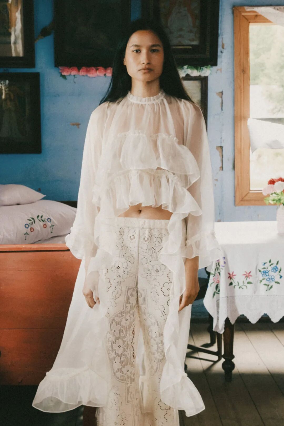 Alberta Ferretti的处理方式则更接近情绪本身。轻盈的长裙在身体周围流动,蕾丝与薄纱像是尚未散去的睡意,被风轻轻牵动。那不是为了取悦镜头的美,而是一种私密的、自我感知的美。你会意识到,这些衣服并不急着被穿去某个场合,它们更像是陪伴身体度过时间的存在。而Rosetta Getty的极简白色礼服,则像一场安静的收尾。没有明显的装饰,没有多余的叙事,只剩下身体与衣服之间的距离。那种距离恰到好处:不紧密到令人不适,也不疏离到失去温度。它让“睡着”这件事,变得非常清醒。