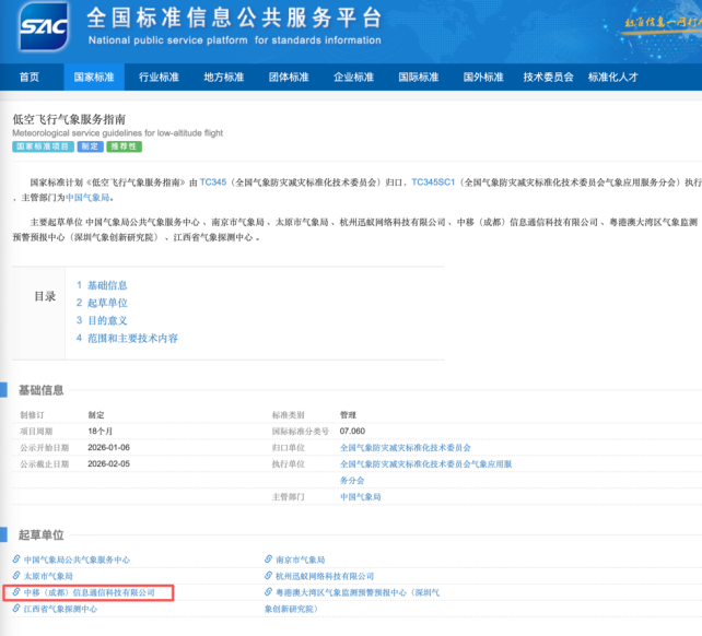 近日,国家标准化管理委员会发布立项公示,由中国移动(成都)产业研究院(以下简称“成研院”)作为唯一运营商单位,协同国家气象局气象服务中心起草的《低空飞行气象服务指南》正式通过国家标准立项。该指南是成研院牵头或参与制定的低空经济领域第7项国家标准,标志着成研院在低空经济标准体系建设中持续发挥核心作用,为无人机规模化、商业化安全运营奠定了重要技术基础。