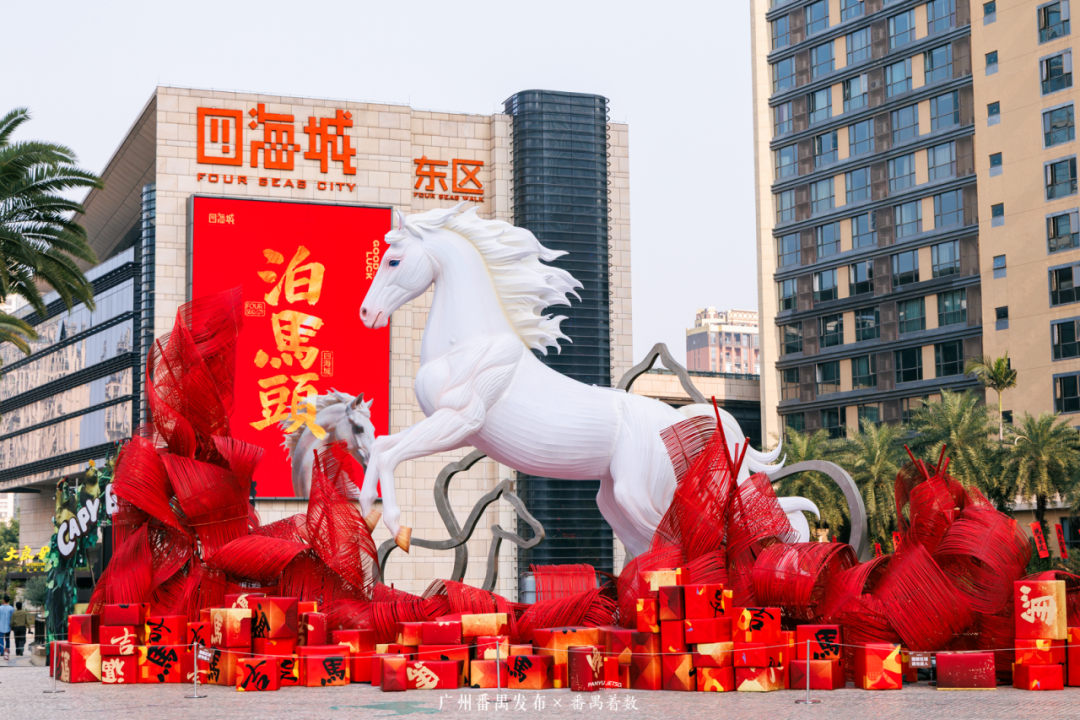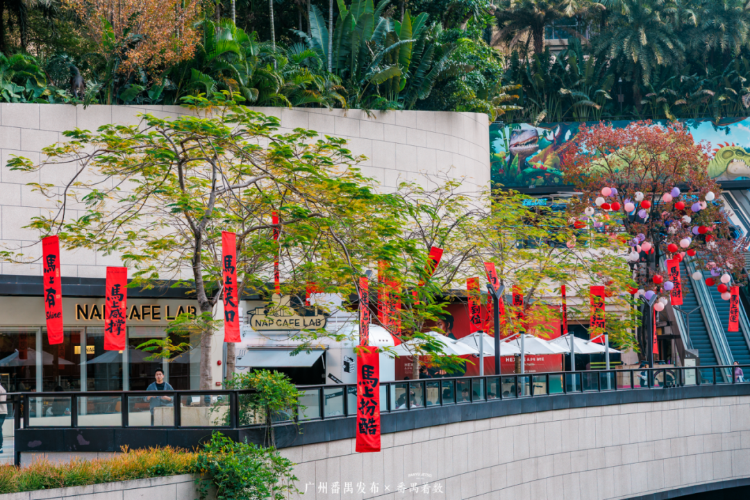 目光所及,是气势恢宏的巨型艺术装置马,昂首腾跃,带来龙马精神的昂扬气象。 环绕四周的绿树上,挂满了书写着“马上福星”、“马上好彩”等吉祥祝福语的创意对联,随风轻舞,将新春的祈愿播撒向四方。