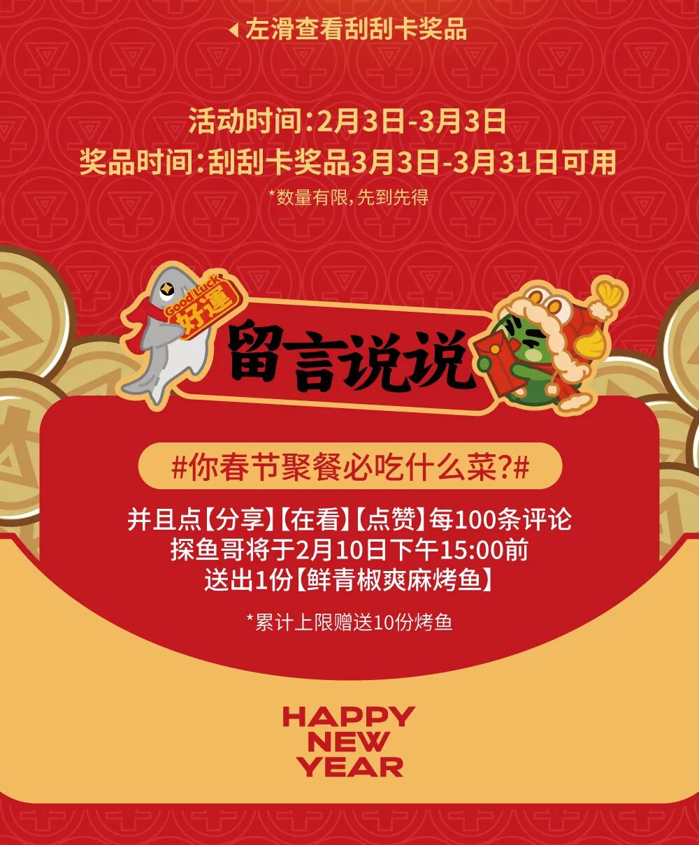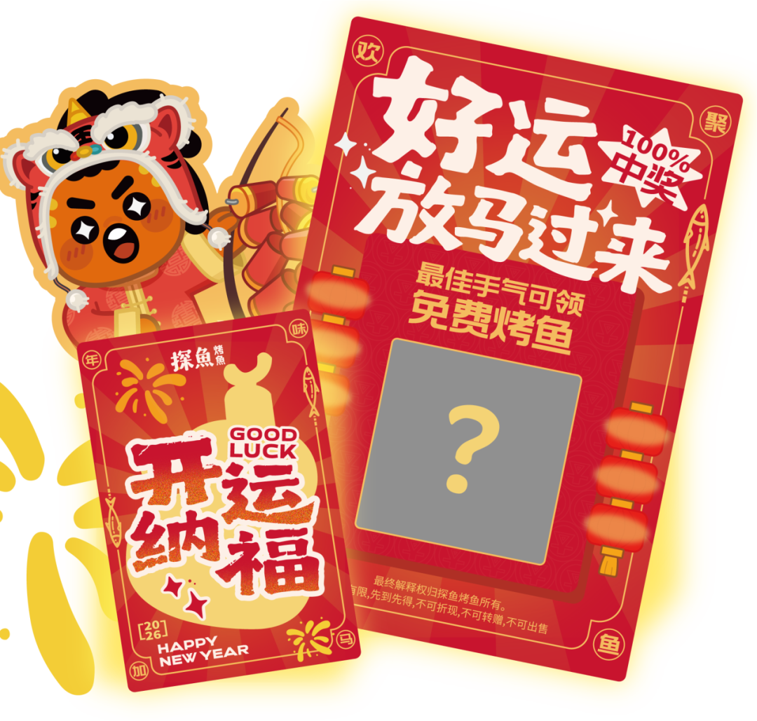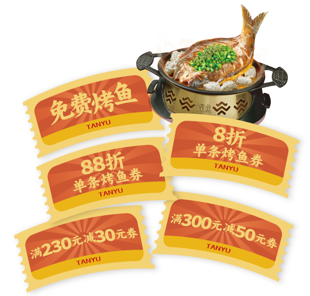 注:1.推文留言活动时间:2026年2月3日-2026年2月10日,2026年2月10日将在留言区公布留言中奖名单,奖品为鲜青椒爽麻烤鱼一份;2.奖品以卡券形式发放至会员卡包,具体卡券有效期与使用规则,可在【探鱼烤鱼】小程序 -【我的】-【优惠券】卡券详情中查看;3.仅限大陆地区探鱼餐厅堂食使用,华为店不参与活动;4.每个订单仅可使用一张卡券,不可与其他优惠同享,餐前不设外带;