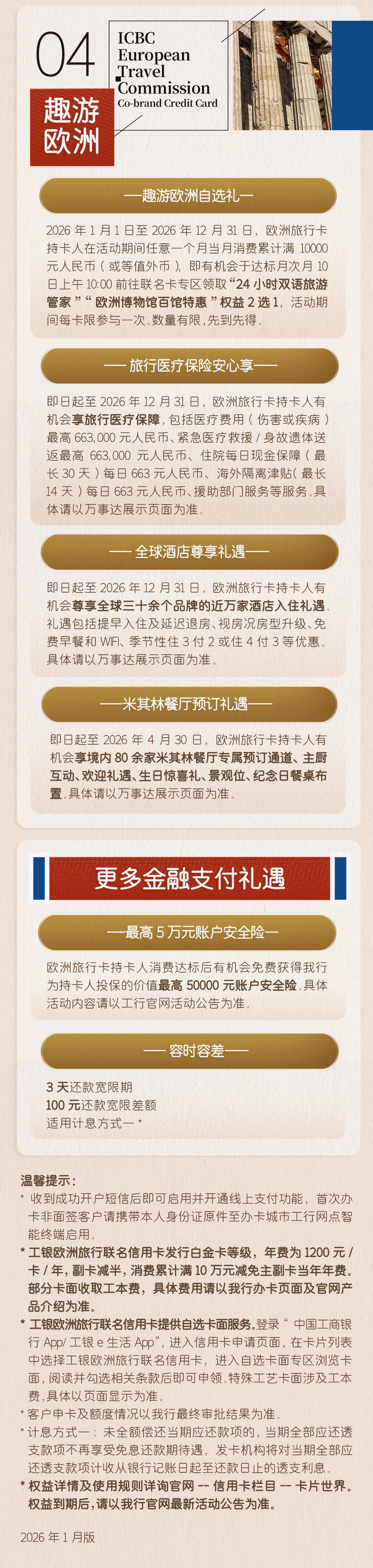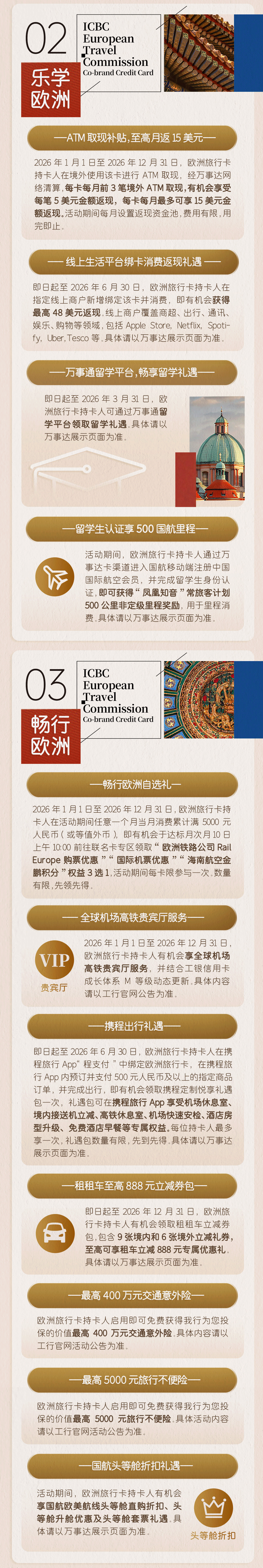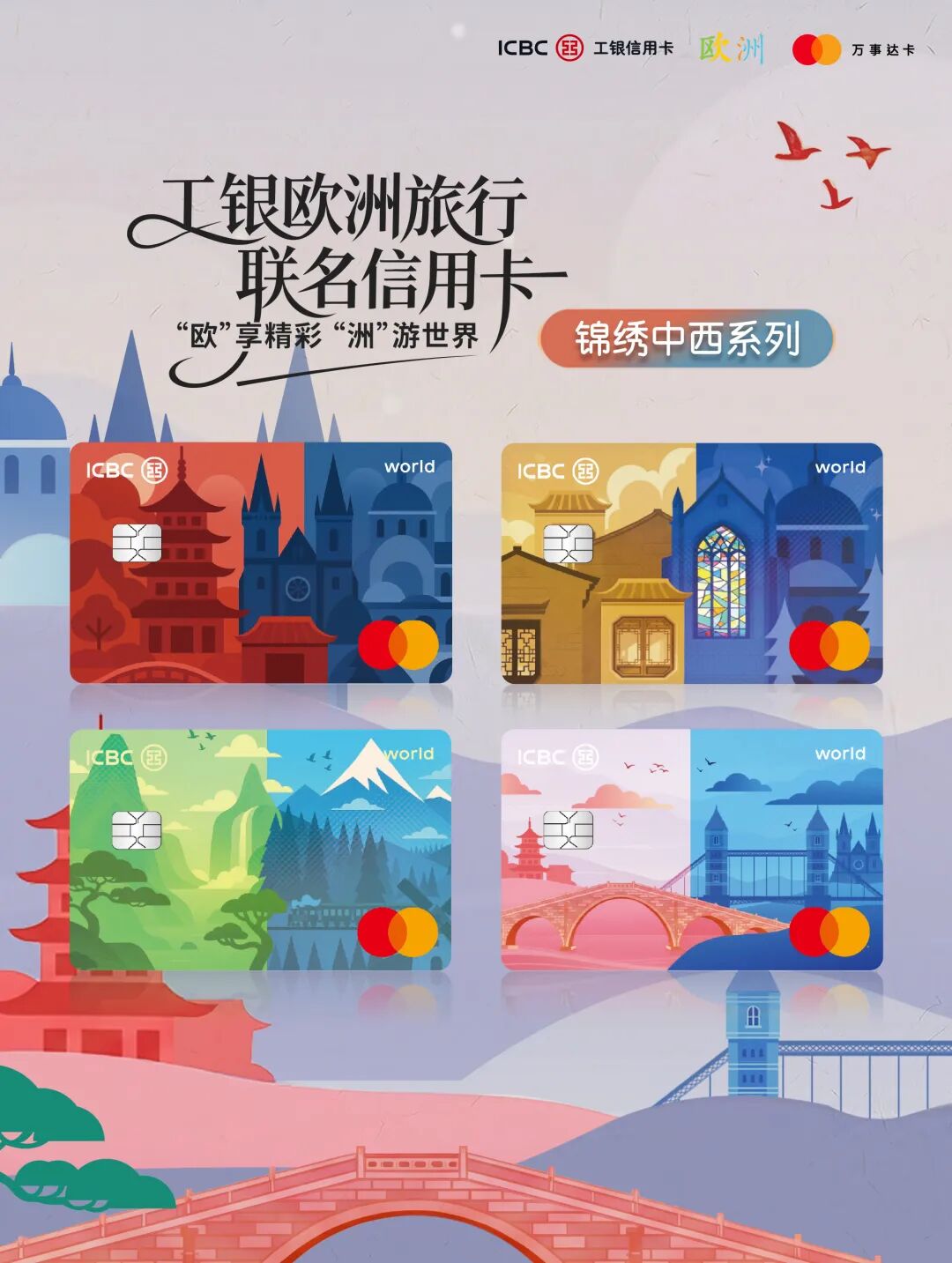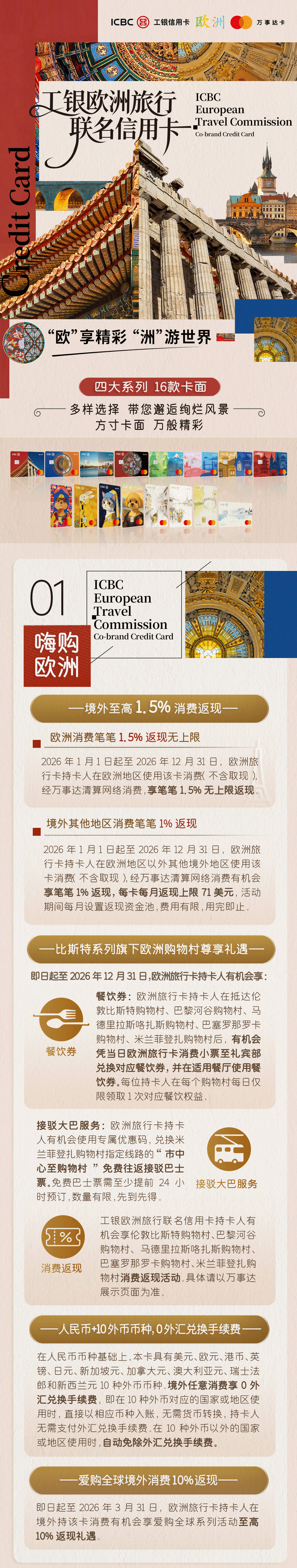 工银万事达欧洲旅行联名信用卡以欧洲优质文旅场景为特色,构建起覆盖“吃、住、行、游、购、娱”的全链条权益体系,为我国出境游客、留学生、出海企业员工等客群提供全方位、高品质的跨境消费支付升级体验。该卡提供“双璧生辉”“传世萌宗”“锦绣中西”“欧陆风物”四大系列,支持人民币及欧元、英镑、瑞士法郎等10种外币直接支付,境内境外都可用。持卡者可享有免收外汇兑换手续费、欧洲消费返现及境外取现补贴等金融权益。同时,该产品融合三方资源优势,为持卡者提供多项热门场景权益,涵盖双语旅游管家、欧洲博物馆门票、购物礼遇、出行回馈等增值服务。