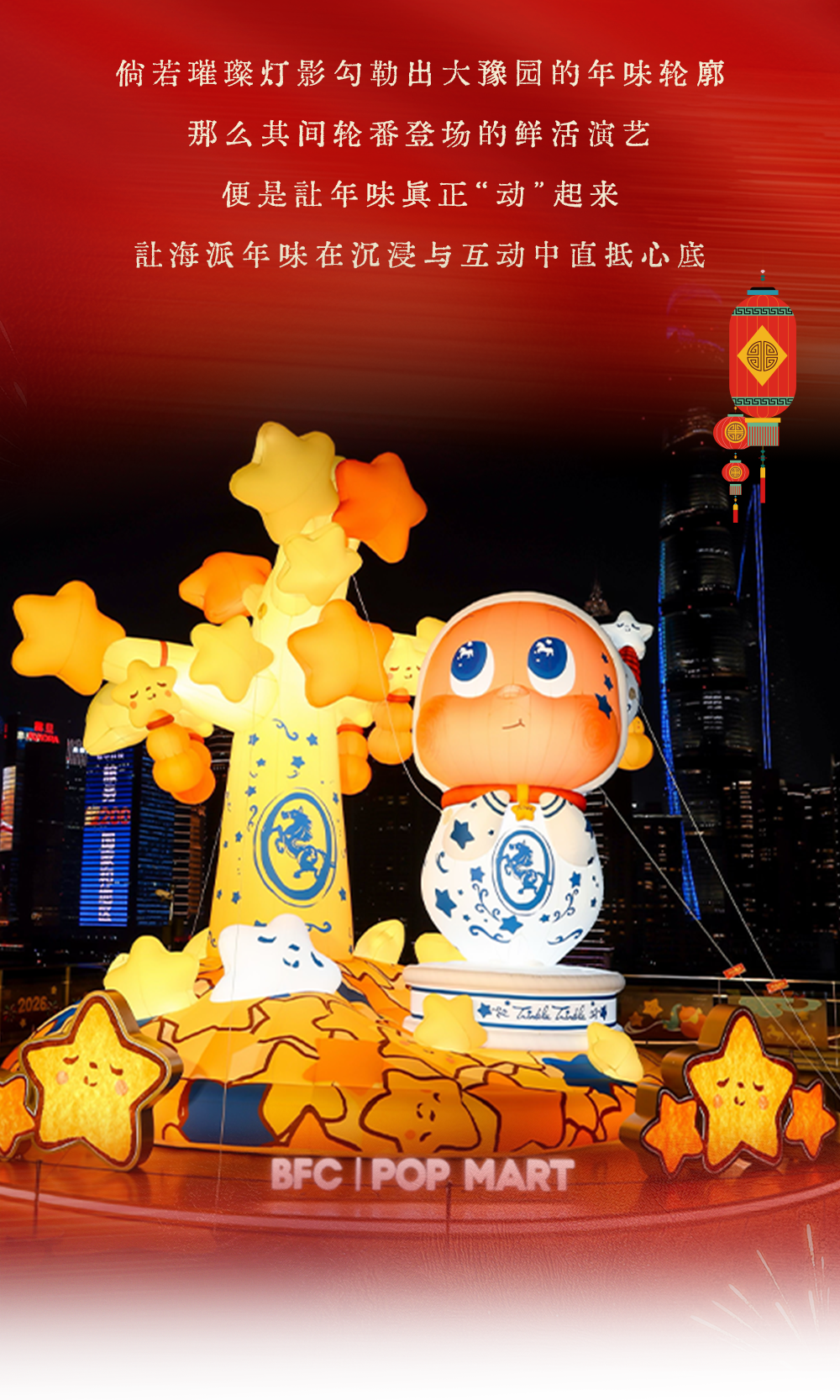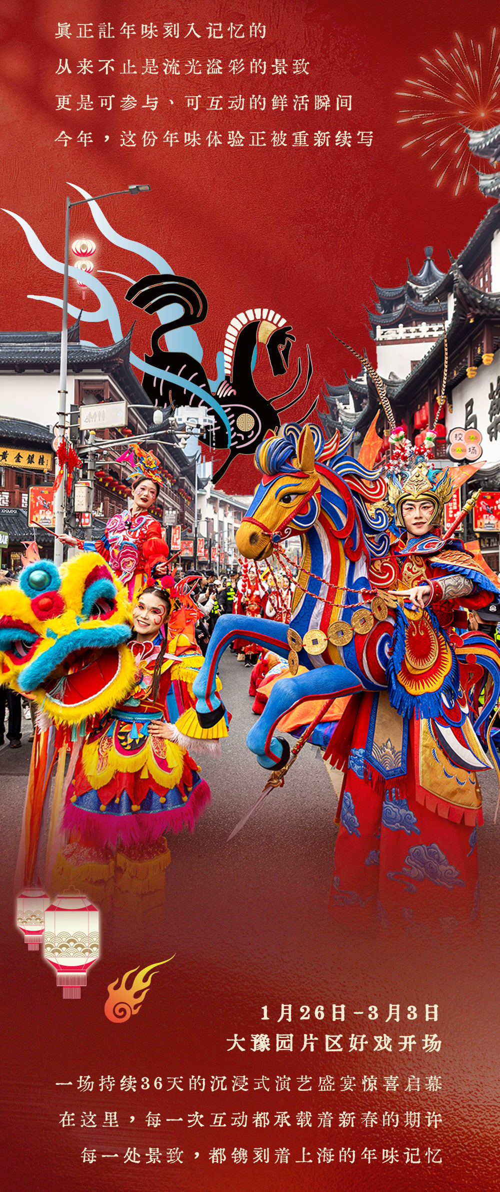 豫园的妙趣,藏在每一次不期而遇里。从古韵萦绕的豫园商城,到摩登新潮的BFC外滩金融中心,大豫园片区将演艺活动串联进每一处景致。步入其中仿佛迈入一场可置身其中的年味大戏。