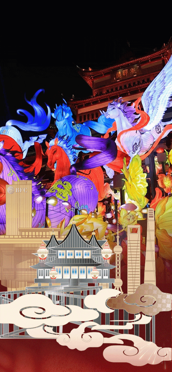 当主灯“骏驰九州”豁然通明,整个豫园仿佛一同苏醒——与此同时,BFC外滩的现代灯组也遥相呼应,大豫园六区同亮,传统与当代在这一刻共燃。