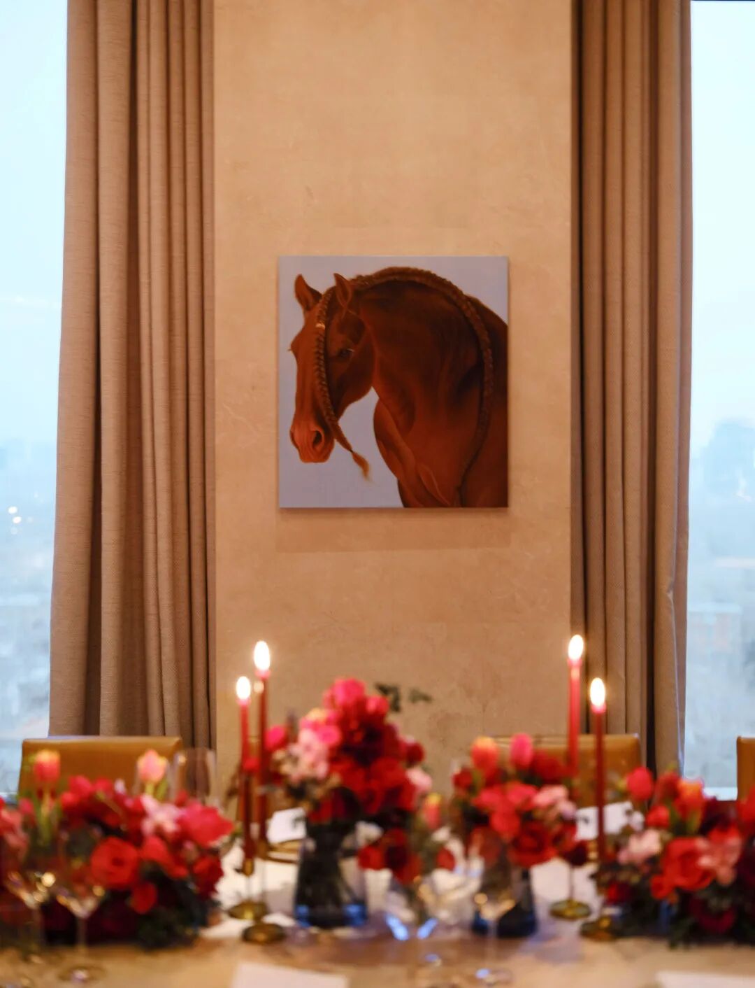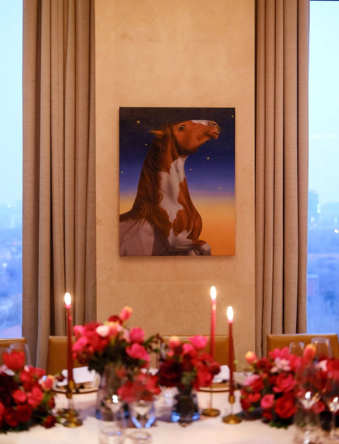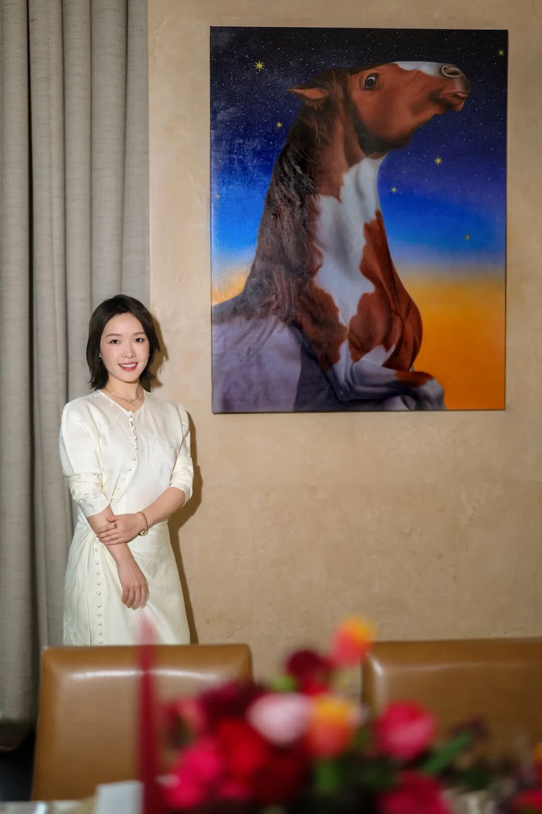 延续着北京宝格丽酒空间中的艺术语法,艺术家魏阳阳的马年定制画作成为今夜的关键落点。她提到自己过往创作常以超现实为核心,而此次作品《星辉马途》更强调动势,画面中的马处在微微腾空的奔腾瞬间,介于起势与落地之间,力量被收束,方向却更明确。背景渐变星空与八芒星元素源自宝格丽的全球视觉体系,象征时间、秩序与恒久,与马所代表的生命力与行动力形成对照与互文。她希望作品承载的不是抵达,而是起势,在新年的起点,把能量聚拢,把未来展开。