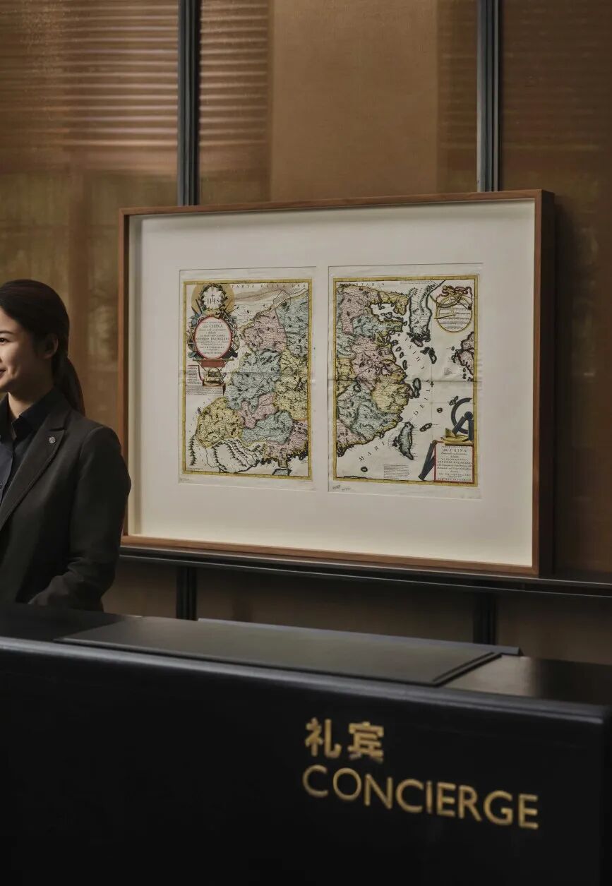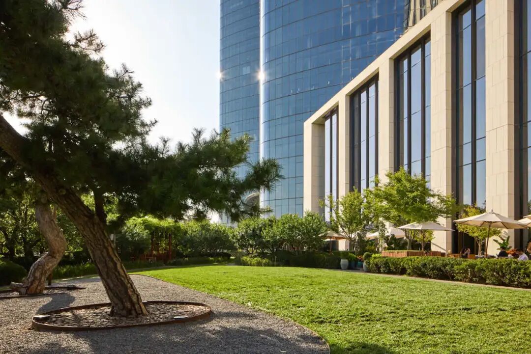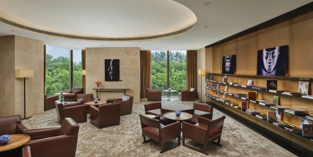 位于酒店二层的图书馆,法国摄影师Olivier Roller的作品,将代表东西方的古典雕塑通过摄影与数字艺术重新诠释,强烈的视觉对比带来一种沉稳静谧的氛围。它邀请住客驻足片刻,感受在时空中贯穿东西的永恒对话。视线移向窗外,花园由瑞士著名园林景观建筑师Enzo Enea设计而成,从中国泰安移植的树龄长达两百年的古松,在城市中心造就静谧绿洲。