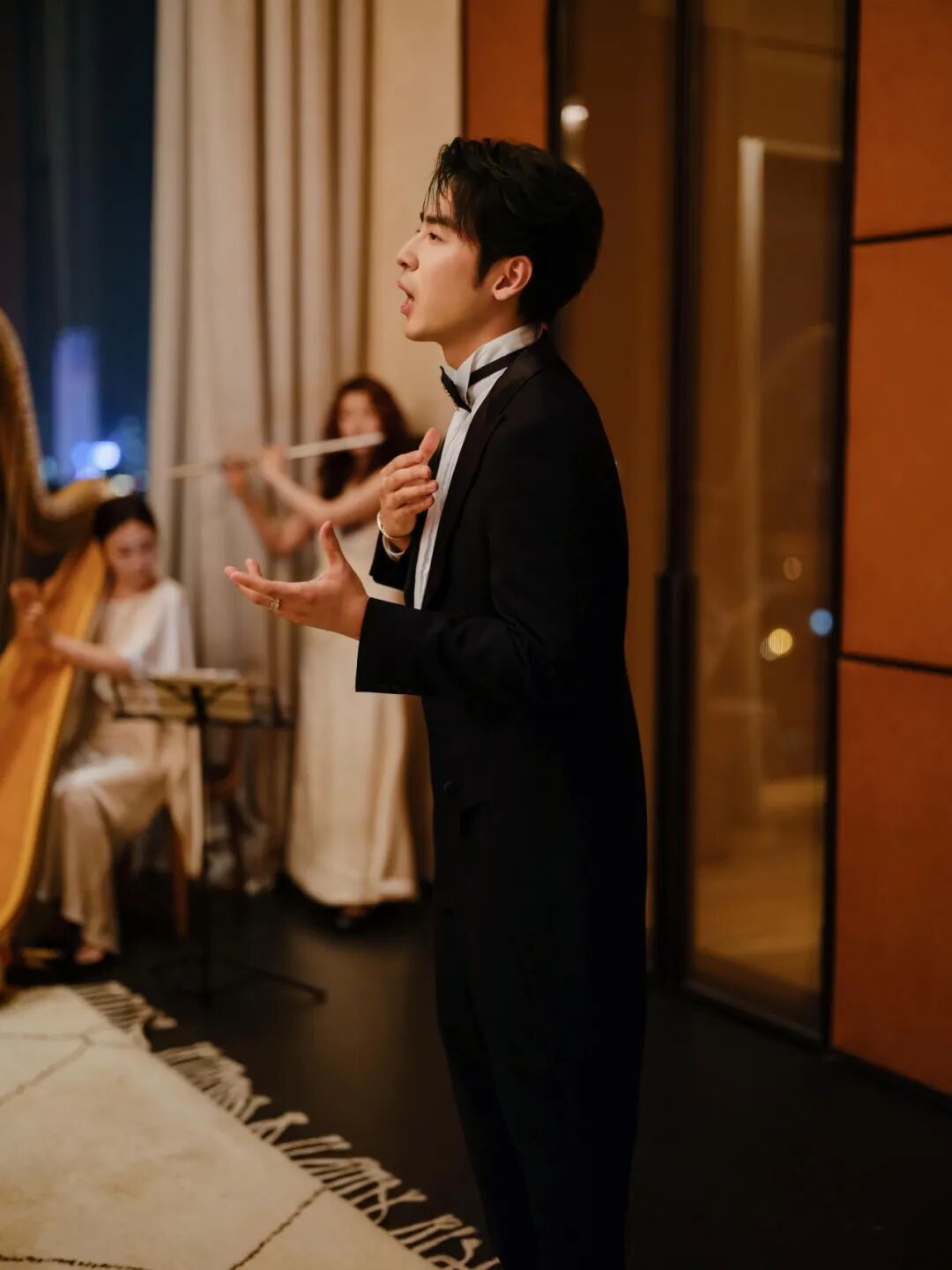 竖琴与长笛合奏先行展开,音色清透,轻轻拉开晚宴的序曲。随后,歌唱家高天鹤以清扬细腻的高音演绎经典曲目,声线明亮而从容,在空间中回旋停驻,为这场夜晚留下动人的节奏。