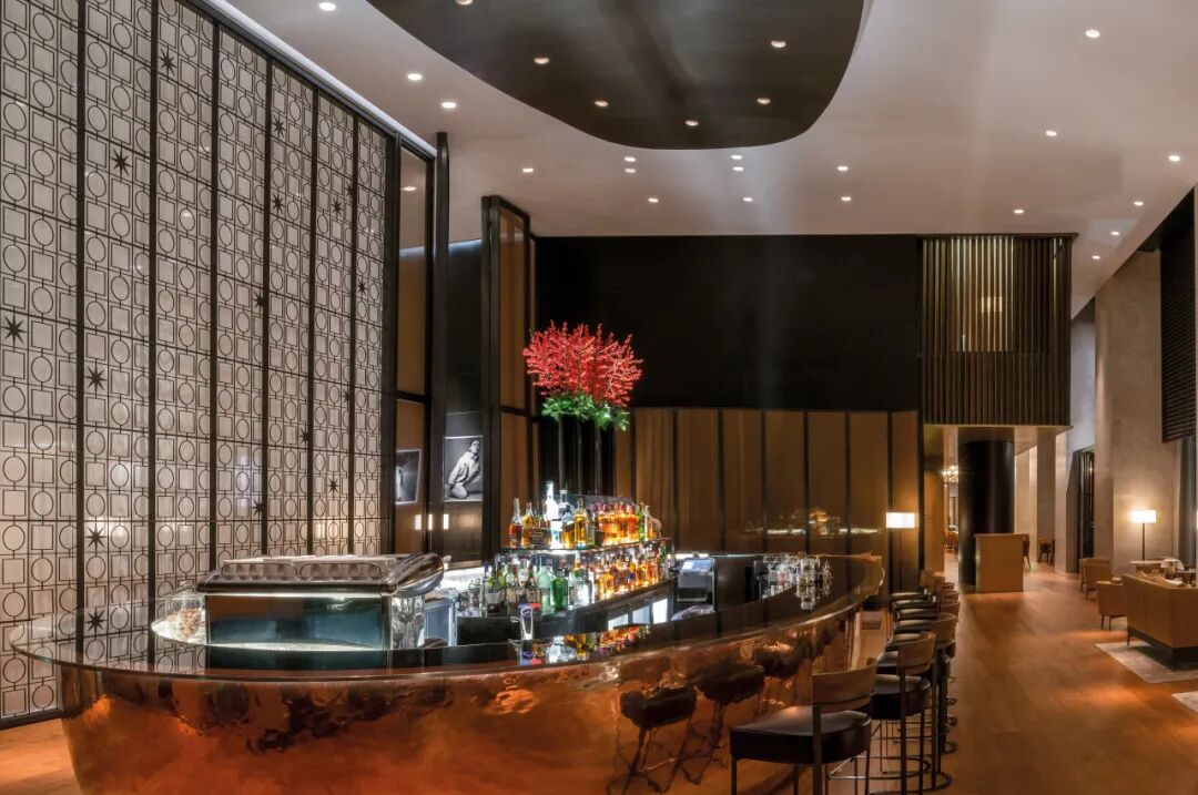 大堂内,黑色大理石台面沉稳压住空间重心,玻璃与青铜相间的屏风收束光线。礼宾台墙面悬挂的世界地图则由意大利画师Vincenzo Maria Coronelli于1690年绘制而成,时间与远方在此落位,为空间更添一层尺度与想象。再向内,宝格丽酒吧与大堂酒廊之间的万神殿图案金属屏风,将罗马的建筑记忆转译为当代结构。酒吧的椭圆形吧台是宝格丽酒店及度假村艺术与品位体验的珍贵标志,以铜为材手工打造,光泽温润而坚定。