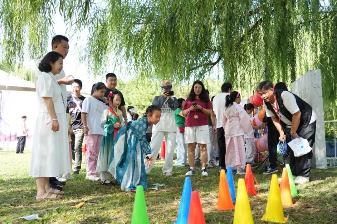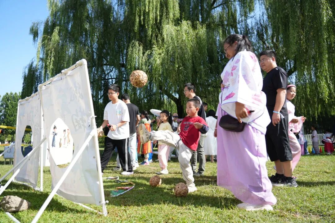 投壶、蹴鞠、沙包、灯谜……传统民俗游戏一个接一个。孩子们兴奋得跑不停,家长们化身最佳搭档。赢到的筹码币还能去市集换小礼物,现场好不热闹!