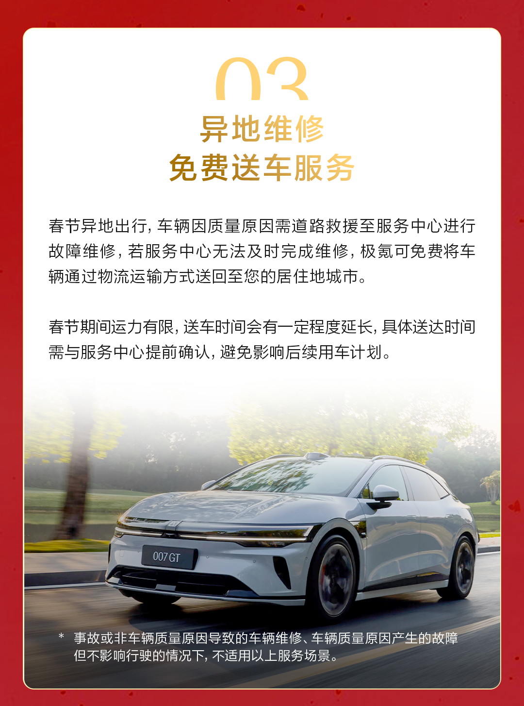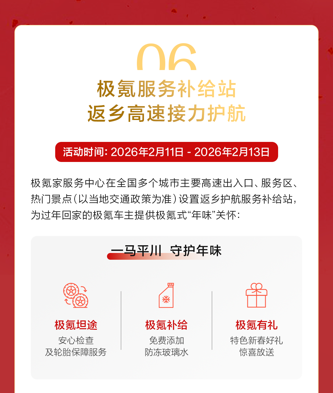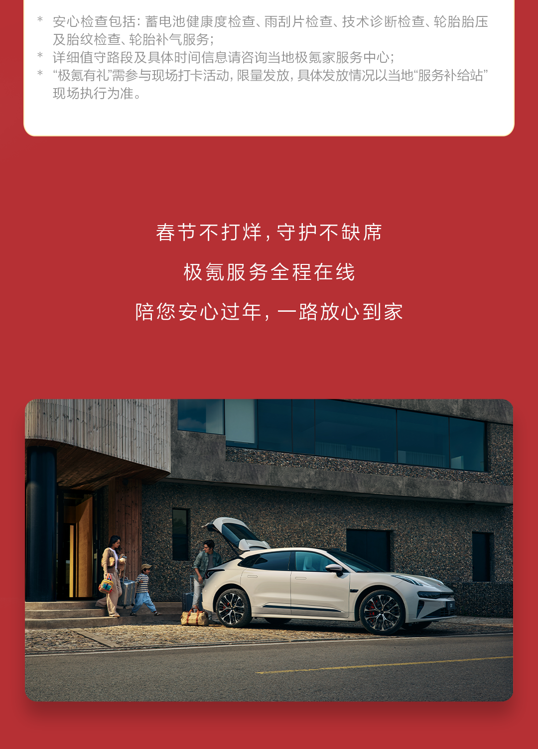 摘要:2月9日-3月3日,极氪春节守护不打烊!六大暖心服务保障,陪您安心过年!