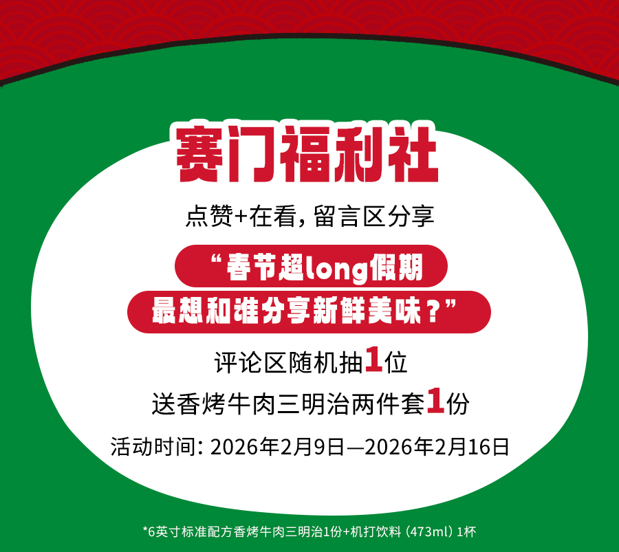 以上为创意图片,仅供参考。SUBWAY®️赛百味可以在法律允许的范围内对活动进行适当调整。SUBWAY®️ is a Registered Trademark of Subway IP LLC ©2026 Subway IP LLC.