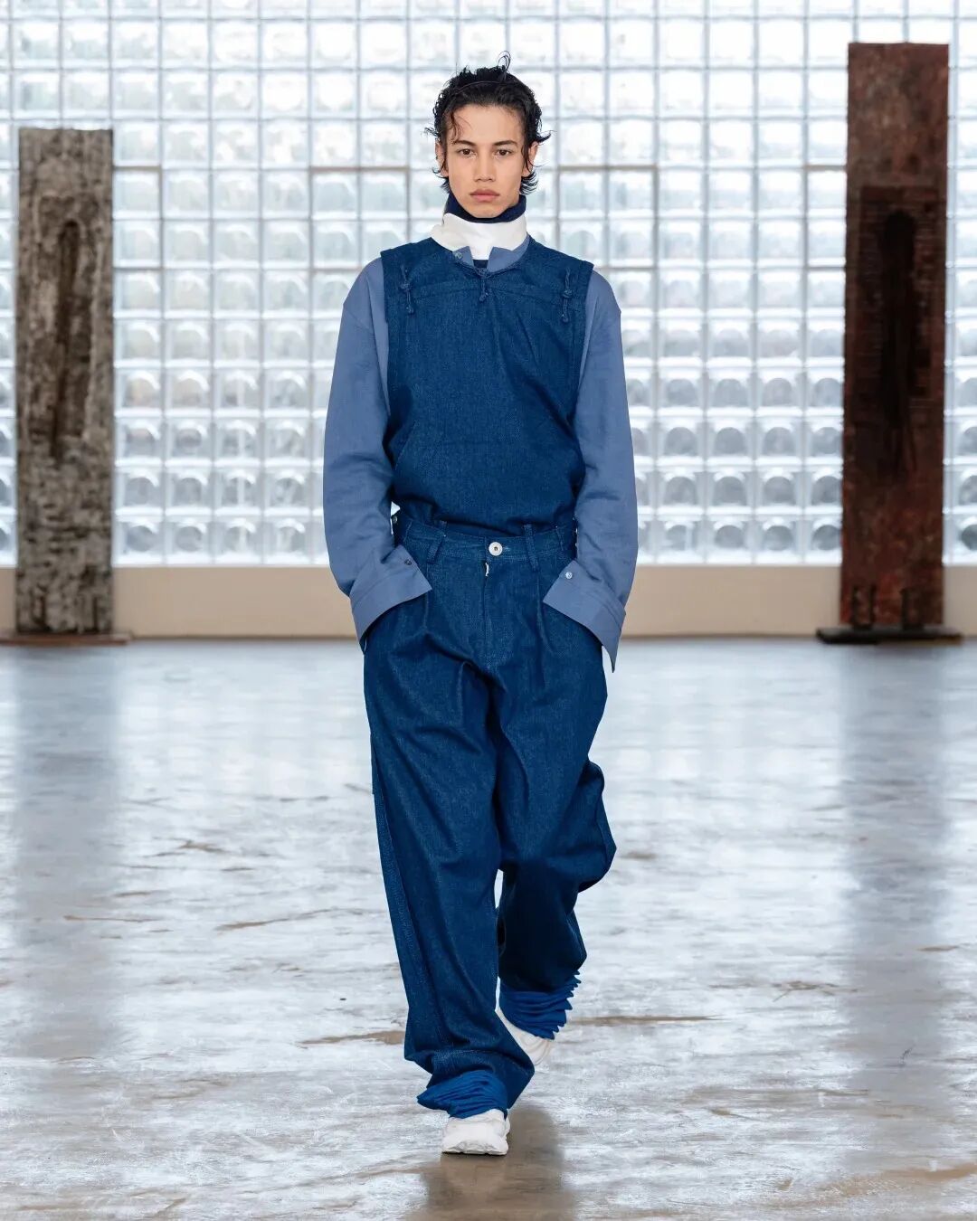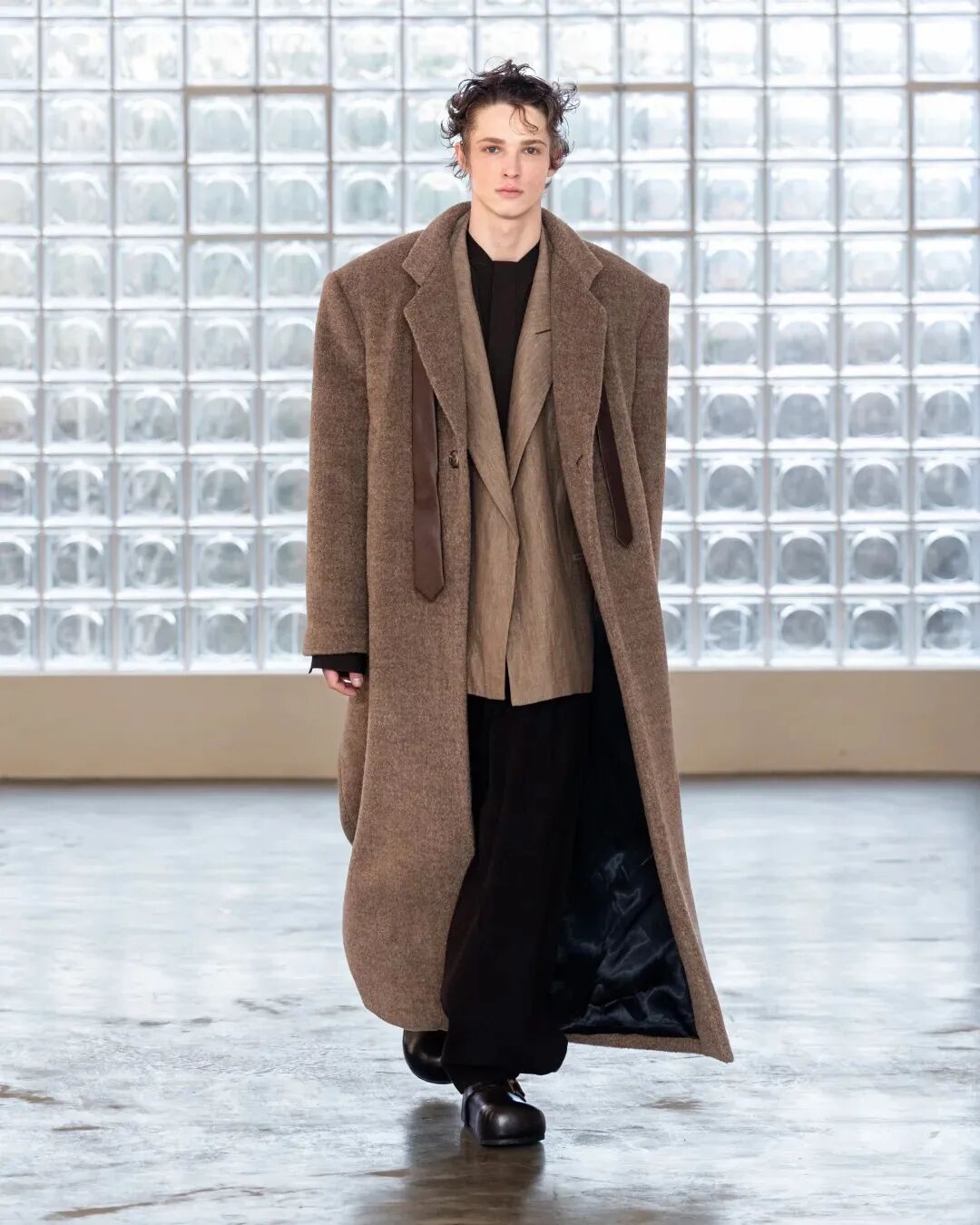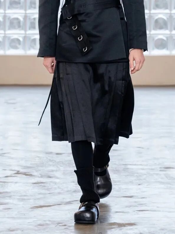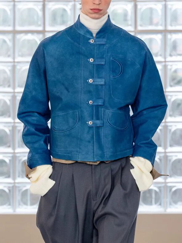 在东方文化与现代时尚的平衡上,两人有着独特默契。他们从不刻意 “堆砌传统元素”,而是将东方哲学作为设计的“底层逻辑”:21 秋冬系列从景德镇瓷器修复工艺中提取的铆钉元素,被融入到裂纹剪裁的服饰之上;23 秋冬系列将 “结绳记事” 与 “甲骨文字” 部首成为灵感起点,设计中的撕裂纹理与银色修补细节,恰似传统锔器工艺的残缺美感;此次 “木塔” 系列,则是首次大量运用唐装与马面裙,用皮革、丝绸与羊毛的碰撞,结合西装剪裁,打破东西方款式壁垒。