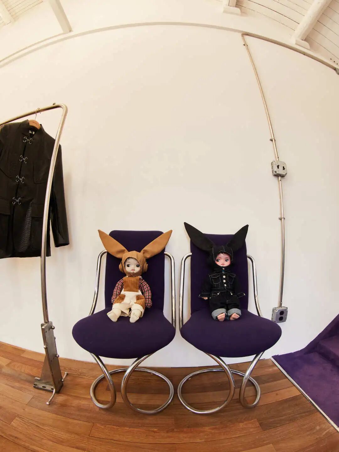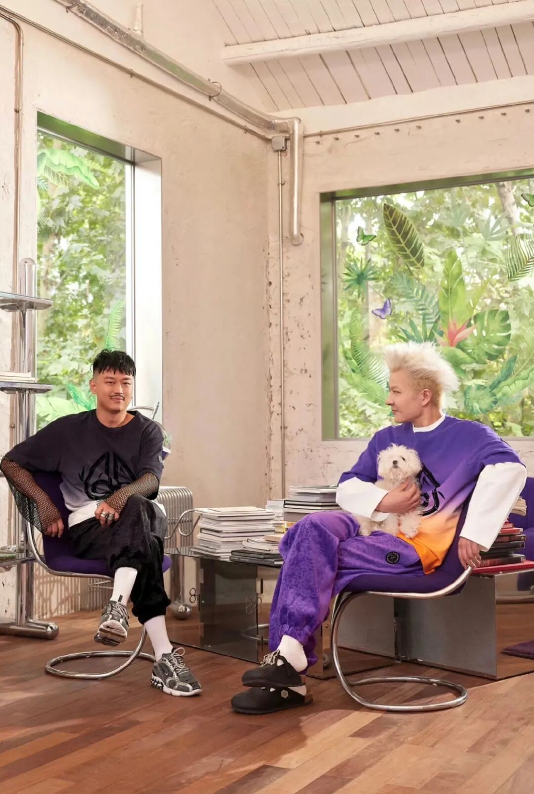 “双设计师的好处是,我们永远能从不同角度看问题,避免 ‘自我局限’。” 周俊提到在与泡泡玛特合作 LABUBU 时,他们共同策划了 “让 LABUBU 跟着品牌去米兰看秀” 的故事线,然后又探讨了用染色技术将其染成紫色的可能性,包括后续将 “绳索元素”、“蝴蝶图案” 融入造型设计中,最终获得超预期的市场反馈,正是二人想法反复打磨后的结果。
