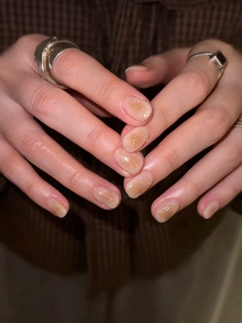 闪片甲油胶还有很多可能性,像无论是涂法稍为稀松点做个渐层款,或是堆砌出饱满的金色,也可以用乳白色、金黄色打底做个腮红美甲,总之玩法很多,就看你喜欢哪一款。